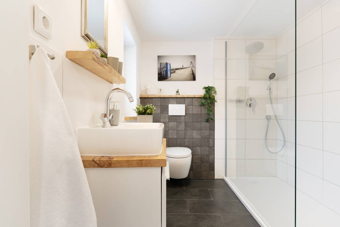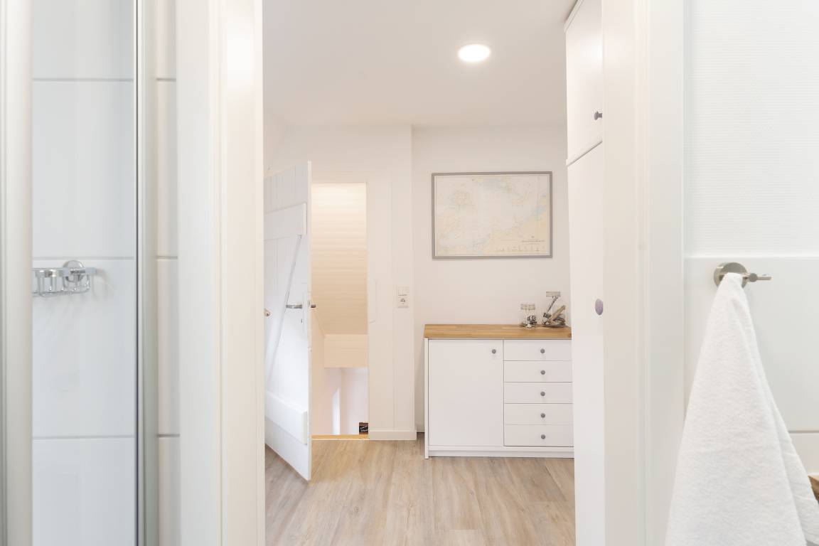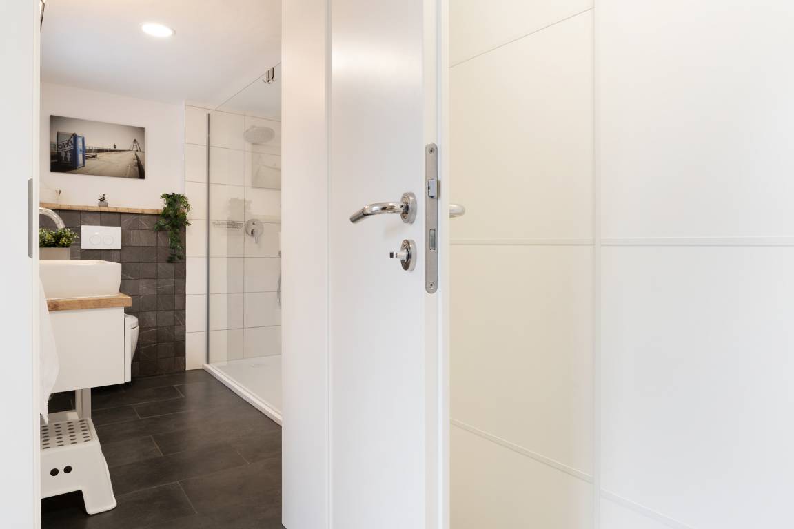 Zwei moderne Bäder runden den Komfort ab. Beide sind mit bodengleichen Duschen und WCs ausgestattet. Im Erdgeschoss sorgt eine Handtuchheizung für angenehme Wärme. Für die kleinen Gäste stehen ein Kinderhochstuhl und ein Kinderreisebett bereit.