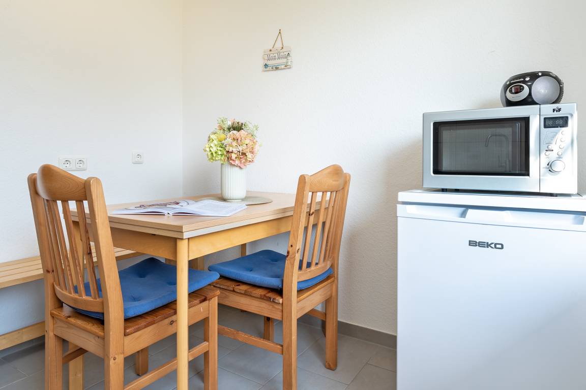 Das gemütliche Wohnzimmer ist in zwei Bereiche aufgeteilt: In dem einen befinden sich eine großen Couch und ein TV, in dem anderen steht ein Schlafsofa. Von hier aus haben Sie Zutritt auf die geräumige, möblierte Süd-Terrasse auf einem Holzdeck. Verbringen Sie hier die schönste Zeit des Jahres in der Sonne oder lassen Sie die Abende bei einem guten Getränk ausklingen. Die Küche ist gut ausgestattet mit Spülmaschine, die Essecke hat ausreichend Platz für ein Frühstück in gemütlicher Runde. Das separate Schlafzimmer ist mit einem bequemen Doppelbett möbliert. Das tageslichthelle Badezimmer ist mit einer Badewanne mit Duschfunktion ausgestattet.