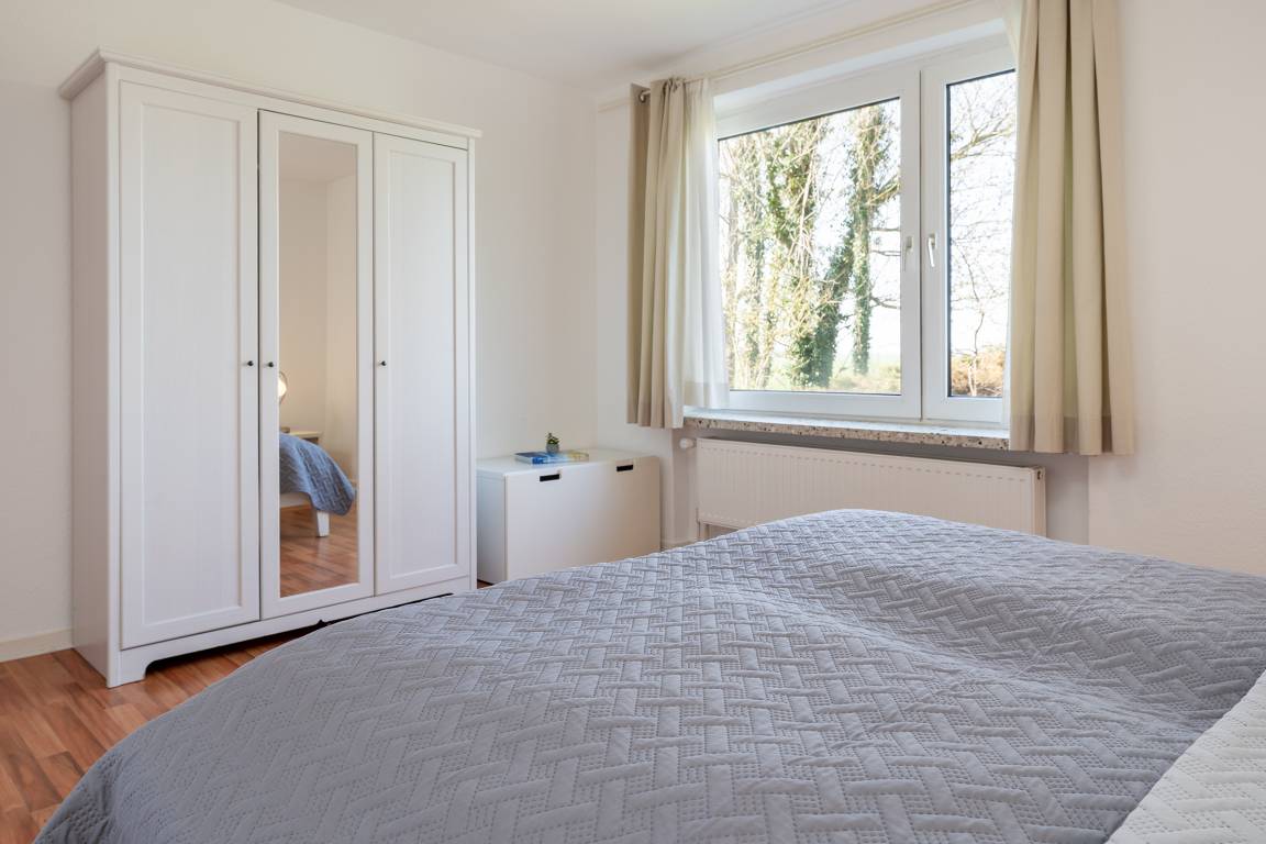 Schlafzimmer: Doppelbett, Verdunkelungsmöglichkeit: Vorhänge