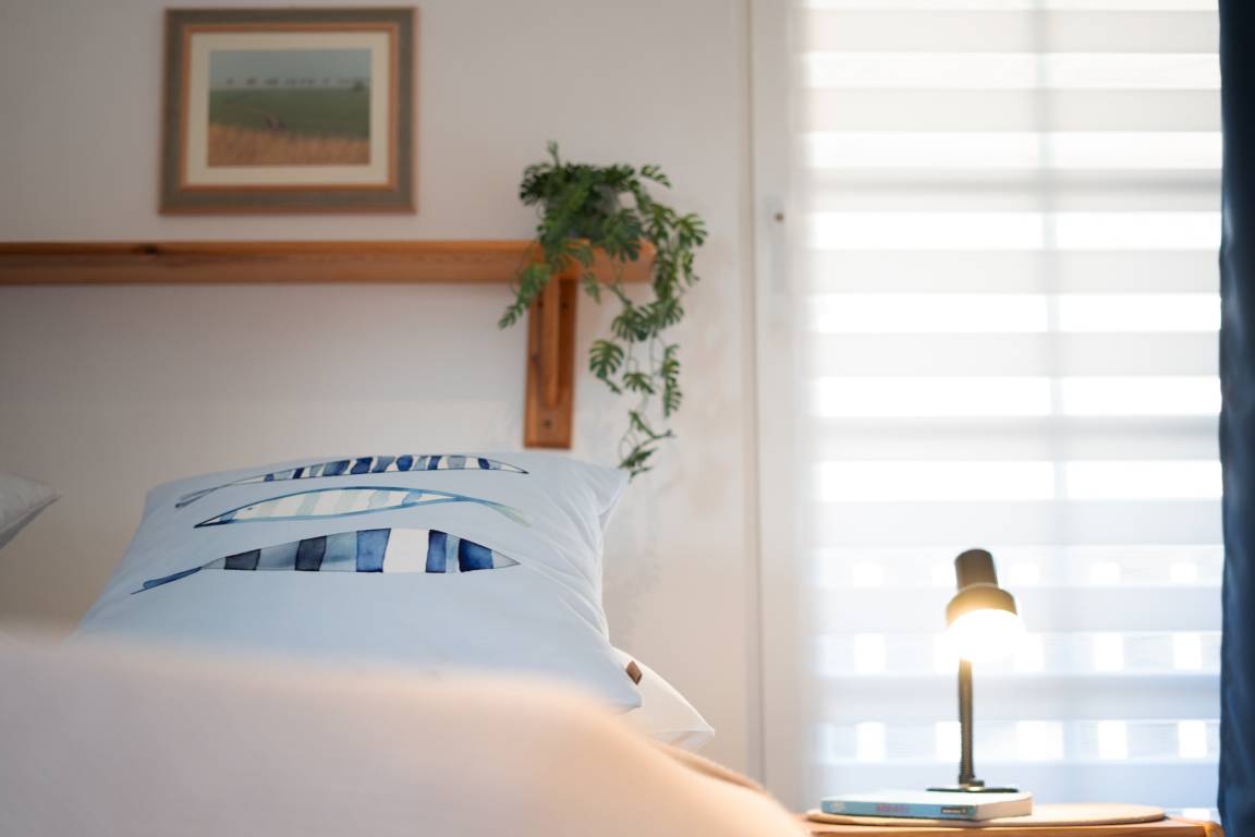 Schlafzimmer 1 (EG): 1 Doppelbett (2x 90x200 cm), Kleiderschrank, Verdunkelung: Verdunkelungsvorhänge, kein Platz für ein Babybett vorhanden