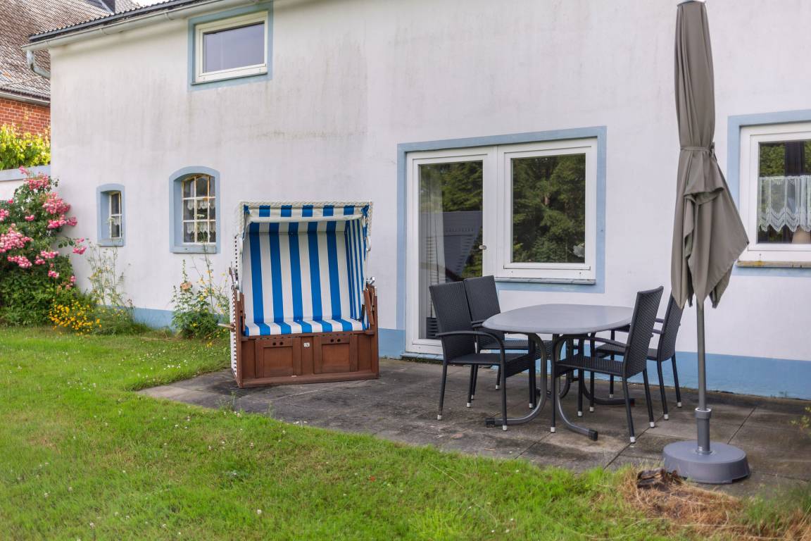 Eigene Terrasse mit Gartenmöbeln und Strandkorb
