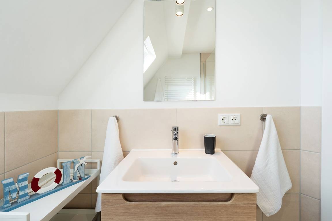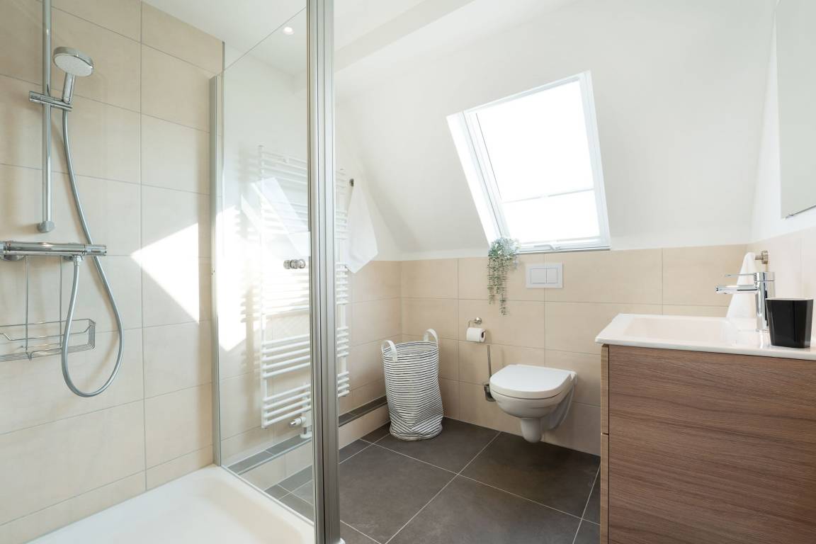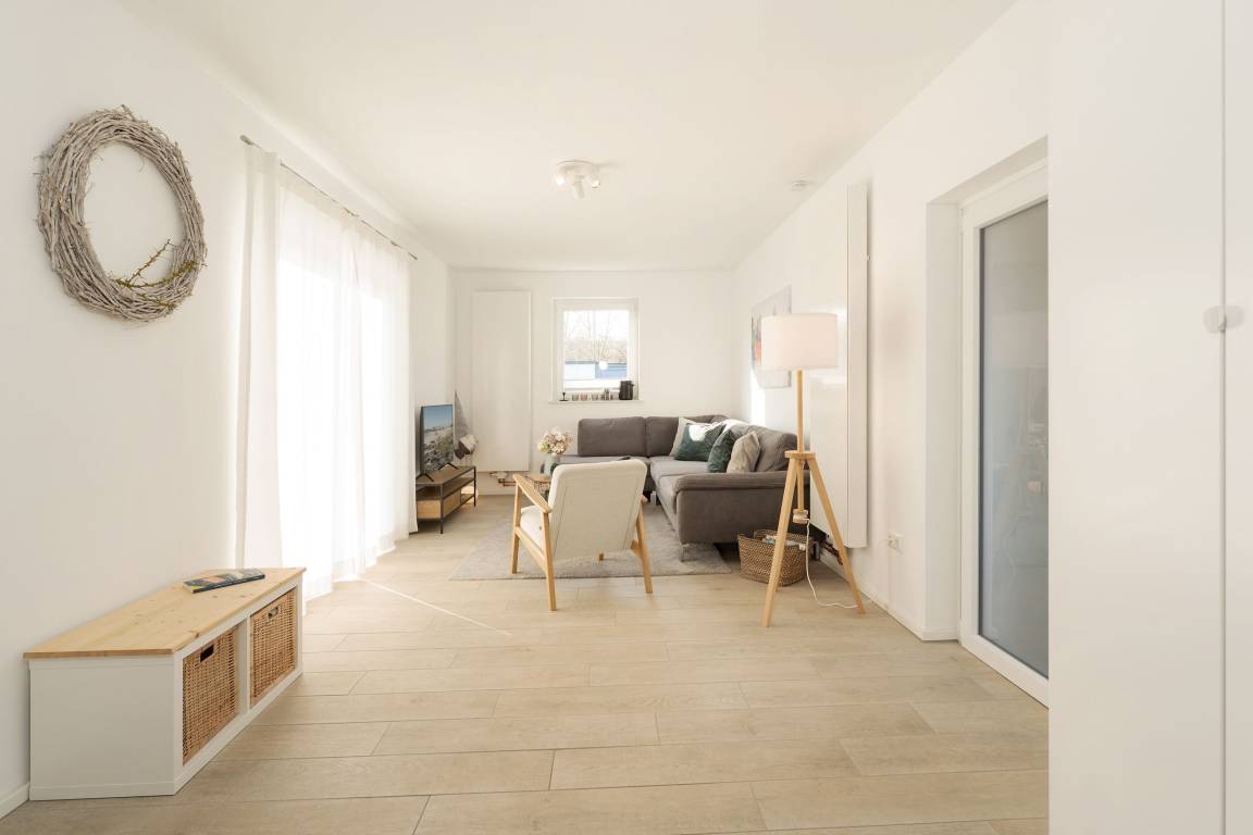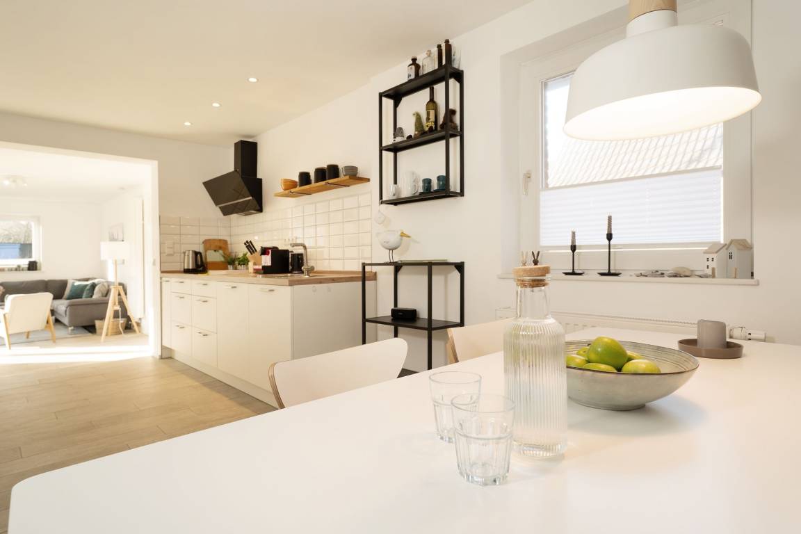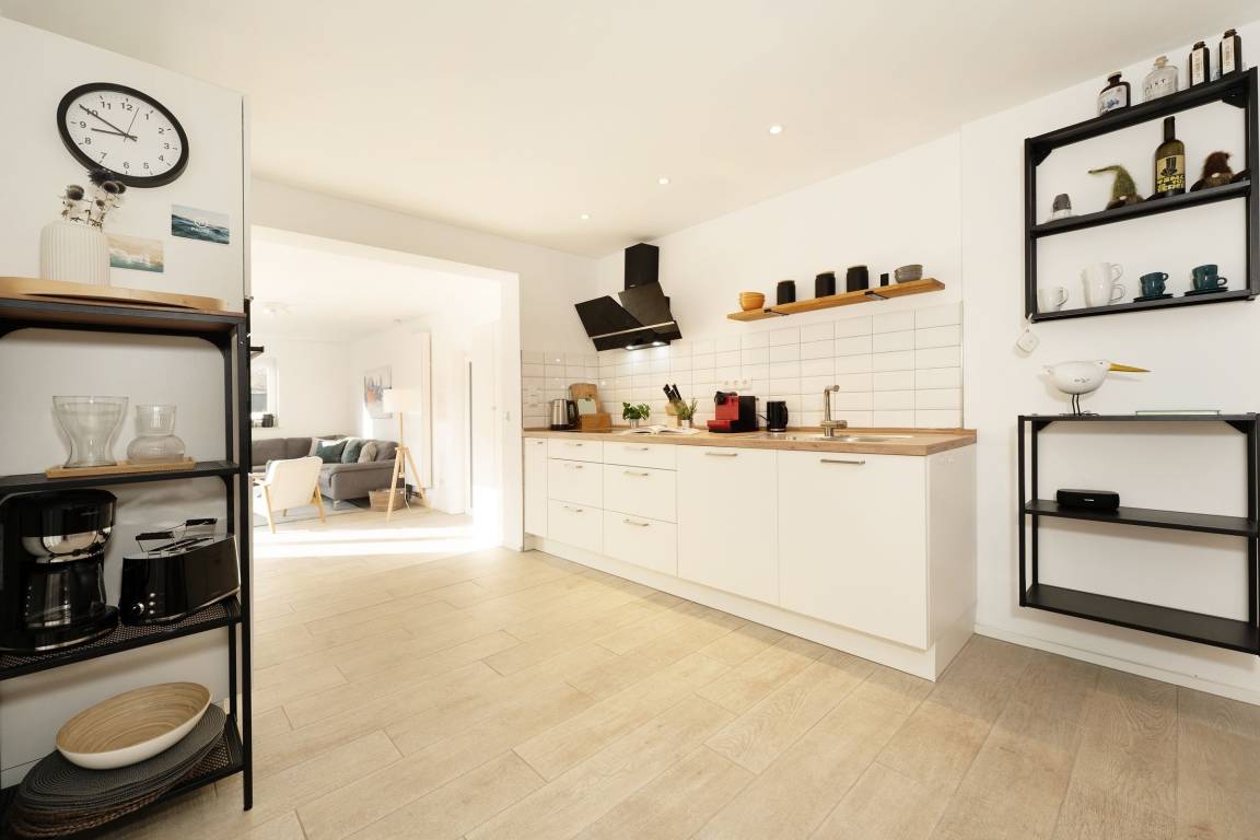 Sie betreten das Haus im Erdgeschoss und gelangen in einen großzügigen Flurbereich, der unter der historischen Holztreppe genug Abstellfläche für einen Kinderwagen, die Koffer oder Einkäufe bereithält. Von hier aus gelangen Sie in die große Wohnküche mit anschließendem Wohnzimmer. Die Küche verfügt neben 4 Cerankochfeldern, Backofen, Spülmaschine und einem Kühlschrank mit Gefrierfach über weitere Küchengeräte wie z. B. Stabmixer, Kaffeemaschine und Wasserkocher. Im Essbereich steht ein großer Tisch mit Bank und Stühlen, sodass sechs Leute bequem Platz finden. Das Wohnzimmer bietet eine sehr gemütliche Couch sowie einen Sessel. Ein Smart-TV mit Magenta-TV Anschluss steht zu Verfügung. Ebenso können eigene Accounts von Amazon Prime, Netflix etc. genutzt werden. Vom Wohnzimmer aus führt eine große Terrassentür auf die windgeschützte Terrasse. Ein Holztisch und 6 Stühle sorgen für einen gemütlichen Aufenthalt und Platz für gemütliche Grillabende. Des Weiteren befinden sich im Erdgeschoss zwei Schlafzimmer, eins mit einem Doppelbett (180x200 cm) und eins mit 2 Einzelbetten, sowie ein großes Badezimmer mit offener Regenfalldusche und Doppelwaschtisch. Wenn Sie die Treppe hinauf gehen, gelangen Sie ins Obergeschoss und stehen direkt im offenen Arbeitsbereich mit WLAN-Anschluss (100 Mbit Leitung). Hier kann man bequem mobil arbeiten, sollte dies nötig sein. Neben diesem sonnendurchfluteten Bereich gibt es noch ein weiteres Schlafzimmer mit Doppelbett (180x200 cm) sowie ein Duschbad.