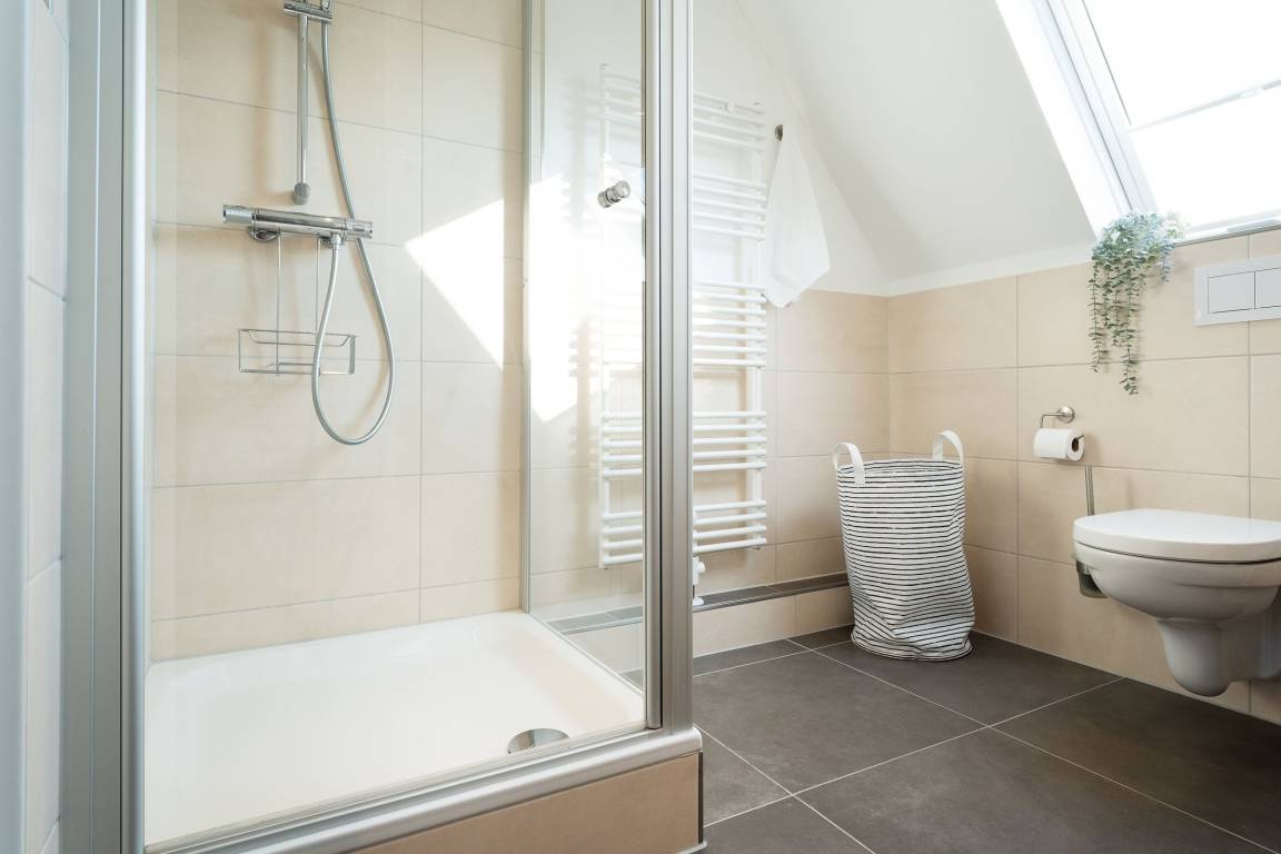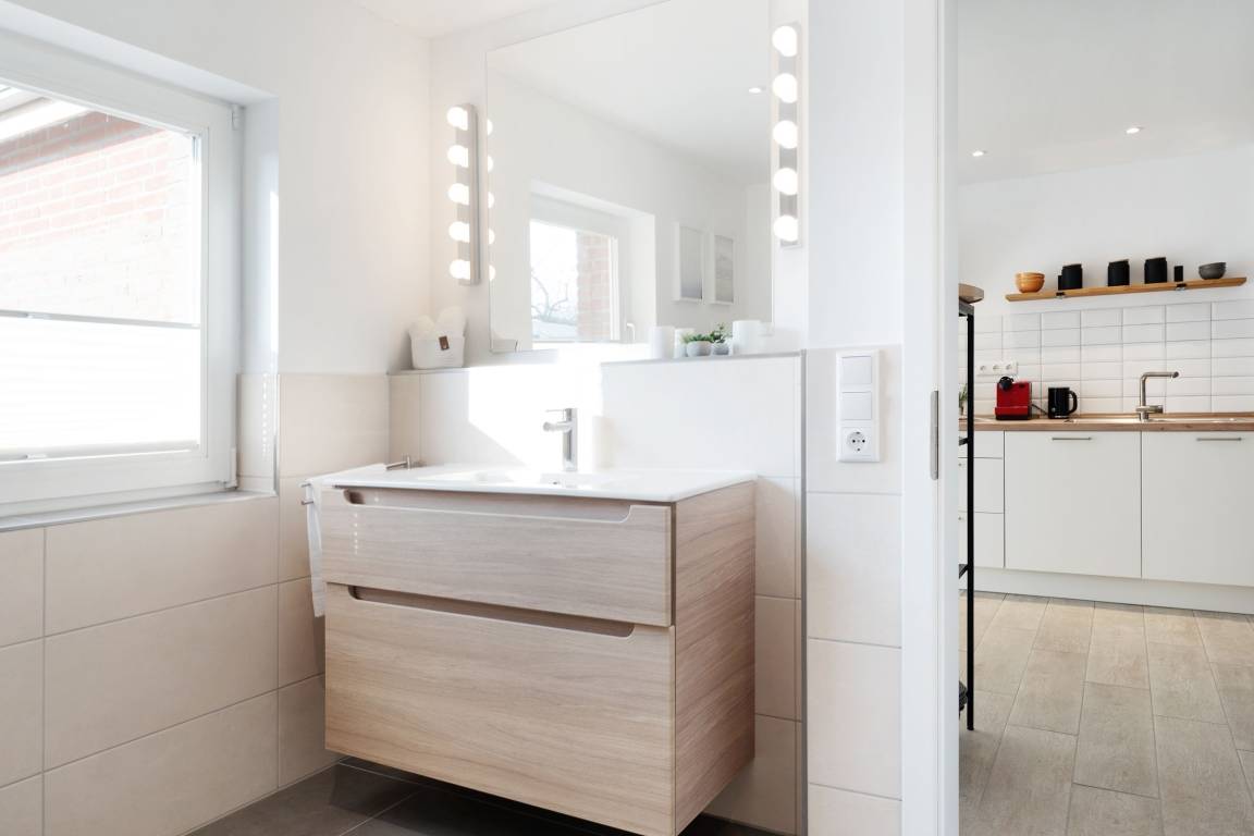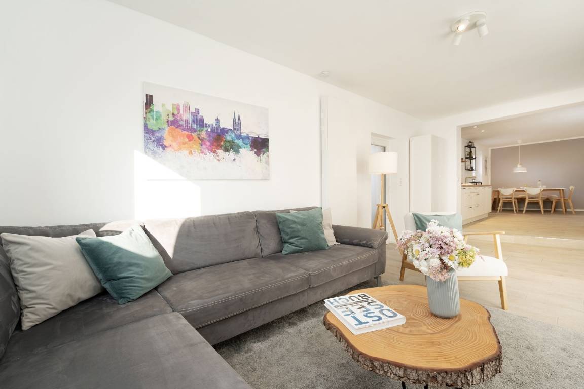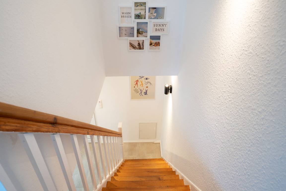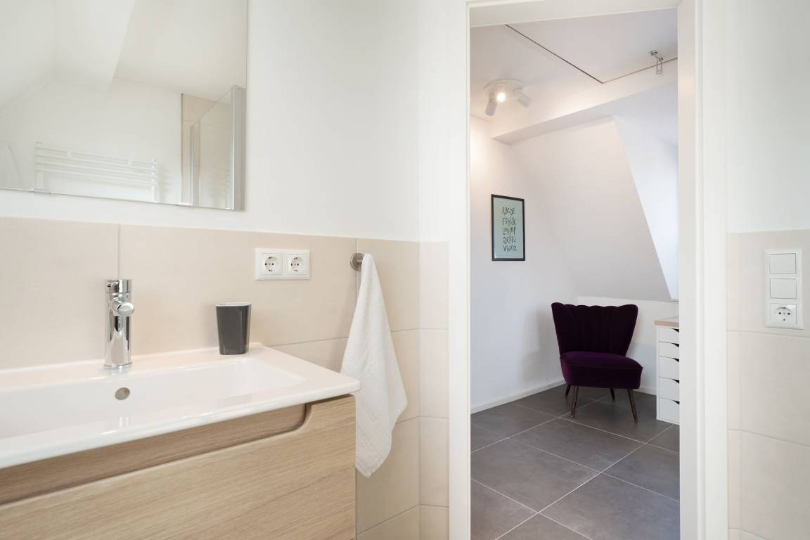 Sie betreten das Haus im Erdgeschoss und gelangen in einen großzügigen Flurbereich, der unter der historischen Holztreppe genug Abstellfläche für einen Kinderwagen, die Koffer oder Einkäufe bereithält. Von hier aus gelangen Sie in die große Wohnküche mit anschließendem Wohnzimmer. Die Küche verfügt neben 4 Cerankochfeldern, Backofen, Spülmaschine und einem Kühlschrank mit Gefrierfach über weitere Küchengeräte wie z. B. Stabmixer, Kaffeemaschine und Wasserkocher. Im Essbereich steht ein großer Tisch mit Bank und Stühlen, sodass sechs Leute bequem Platz finden. Das Wohnzimmer bietet eine sehr gemütliche Couch sowie einen Sessel. Ein Smart-TV mit Magenta-TV Anschluss steht zu Verfügung. Ebenso können eigene Accounts von Amazon Prime, Netflix etc. genutzt werden. Vom Wohnzimmer aus führt eine große Terrassentür auf die windgeschützte Terrasse. Ein Holztisch und 6 Stühle sorgen für einen gemütlichen Aufenthalt und Platz für gemütliche Grillabende. Des Weiteren befinden sich im Erdgeschoss zwei Schlafzimmer, eins mit einem Doppelbett (180x200 cm) und eins mit 2 Einzelbetten, sowie ein großes Badezimmer mit offener Regenfalldusche und Doppelwaschtisch. Wenn Sie die Treppe hinauf gehen, gelangen Sie ins Obergeschoss und stehen direkt im offenen Arbeitsbereich mit WLAN-Anschluss (100 Mbit Leitung). Hier kann man bequem mobil arbeiten, sollte dies nötig sein. Neben diesem sonnendurchfluteten Bereich gibt es noch ein weiteres Schlafzimmer mit Doppelbett (180x200 cm) sowie ein Duschbad.