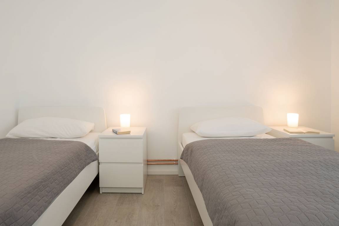Schlafzimmer 2 (EG): 2 Einzelbetten (zusammenschiebbar), Kleiderschrank, Verdunkelung (Vorhänge)
