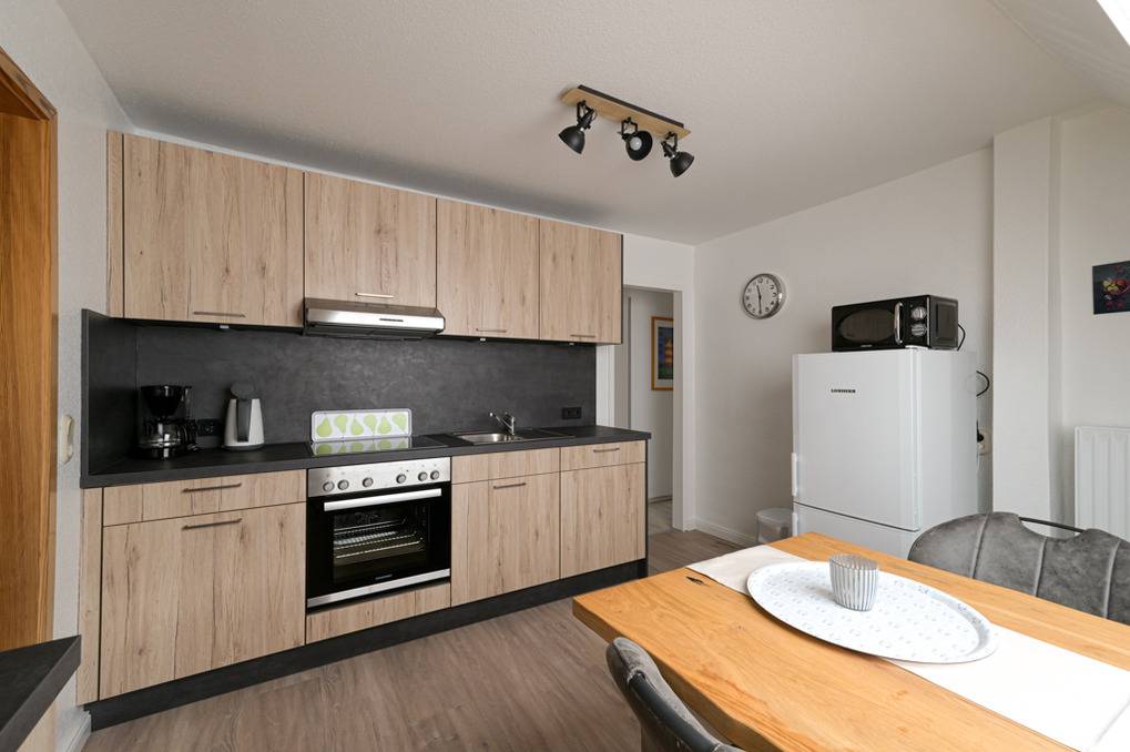 Die Küche mit Esstisch ist komplett ausgestattet mit Geschirrspüler, Mikrowelle und allem was man braucht.