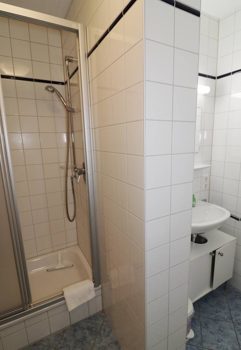 Im Bad gibt es ein WC und eine Dusche. Ein Föhn und ein Kosmetikspiegel sind vorhanden.