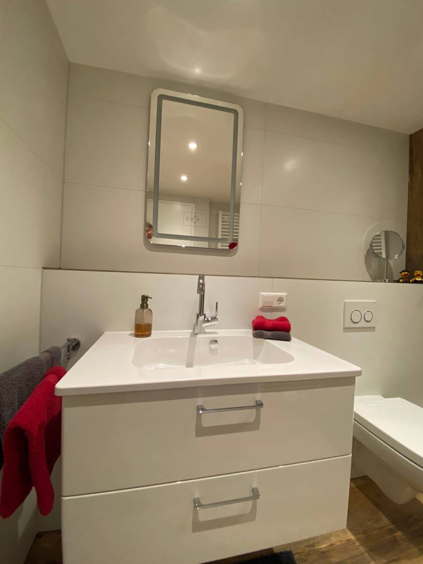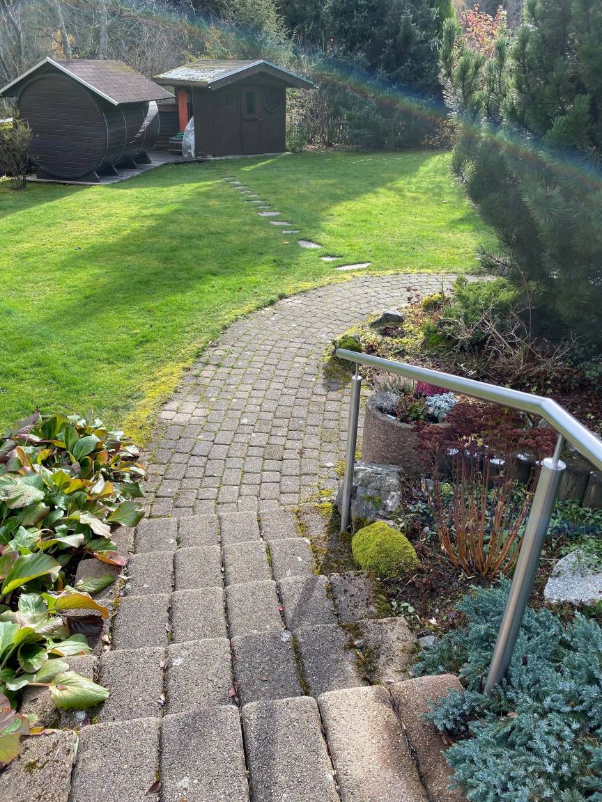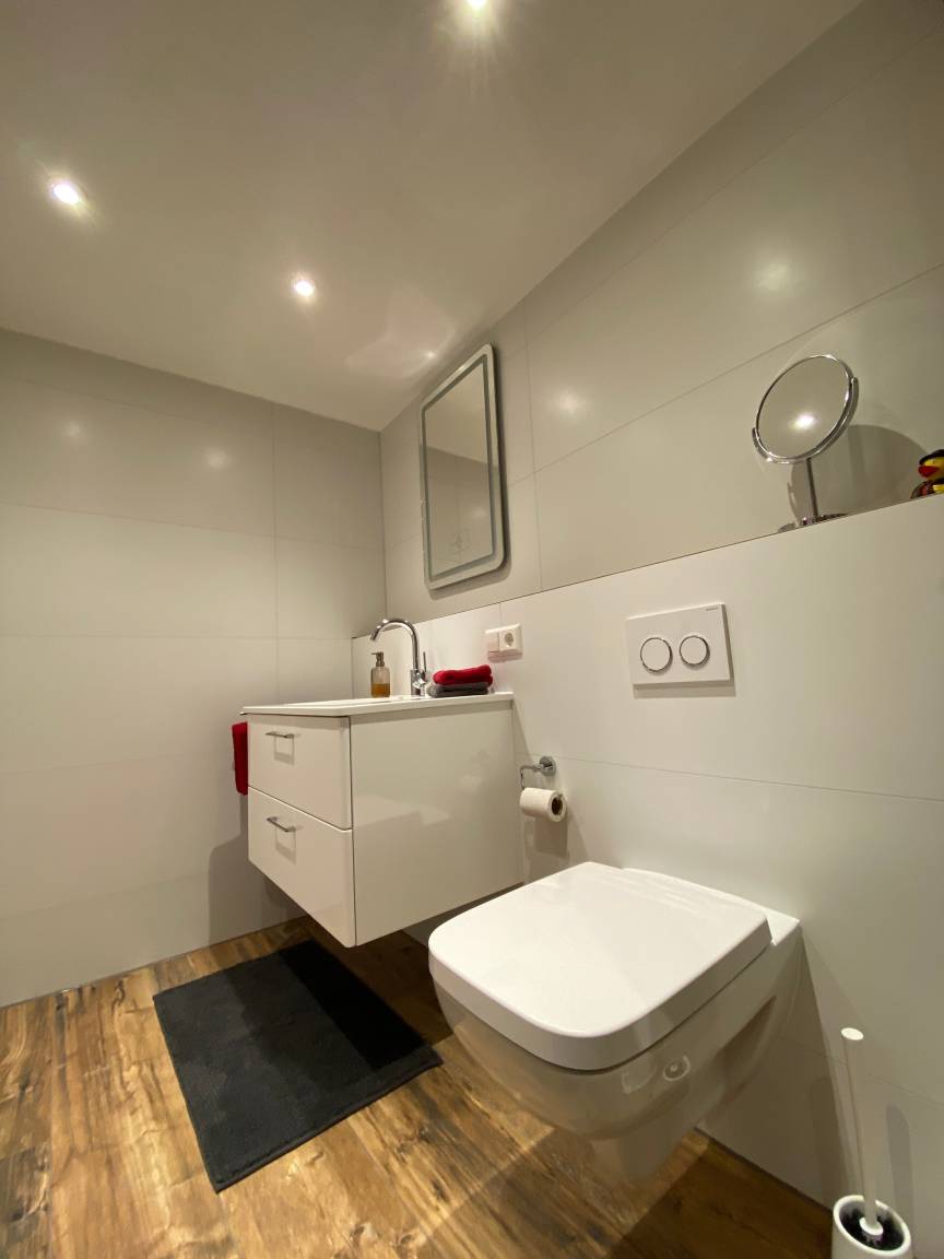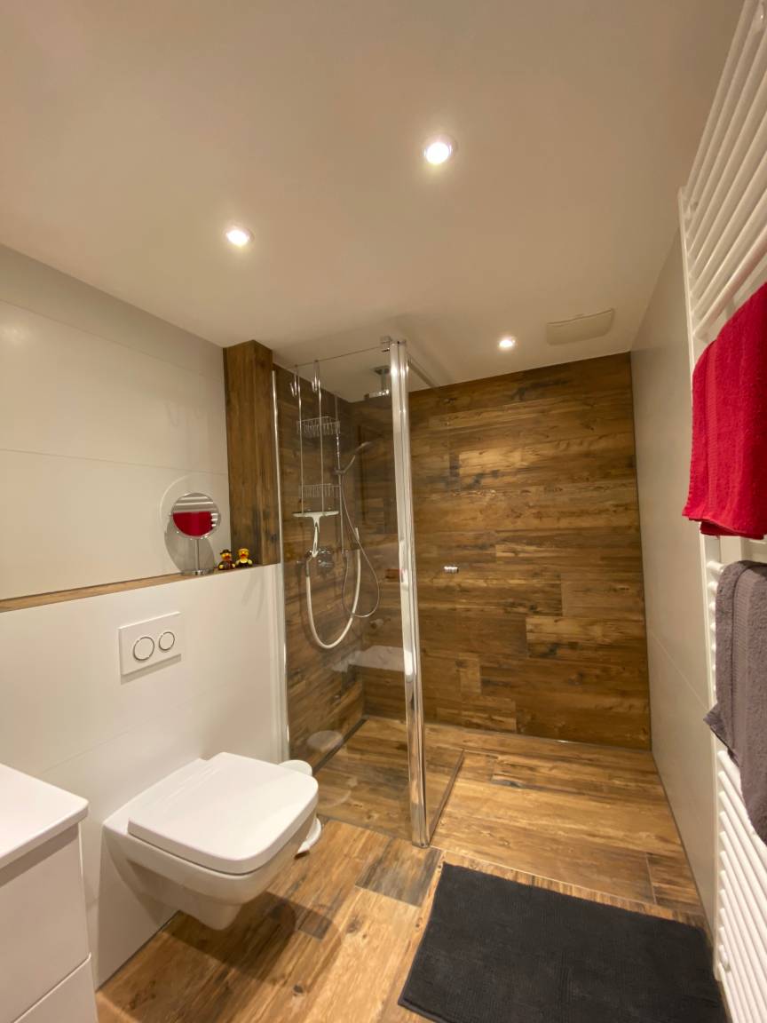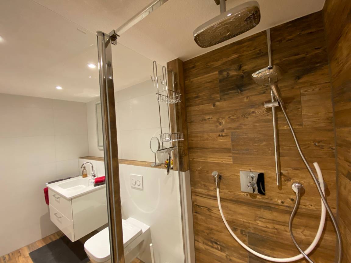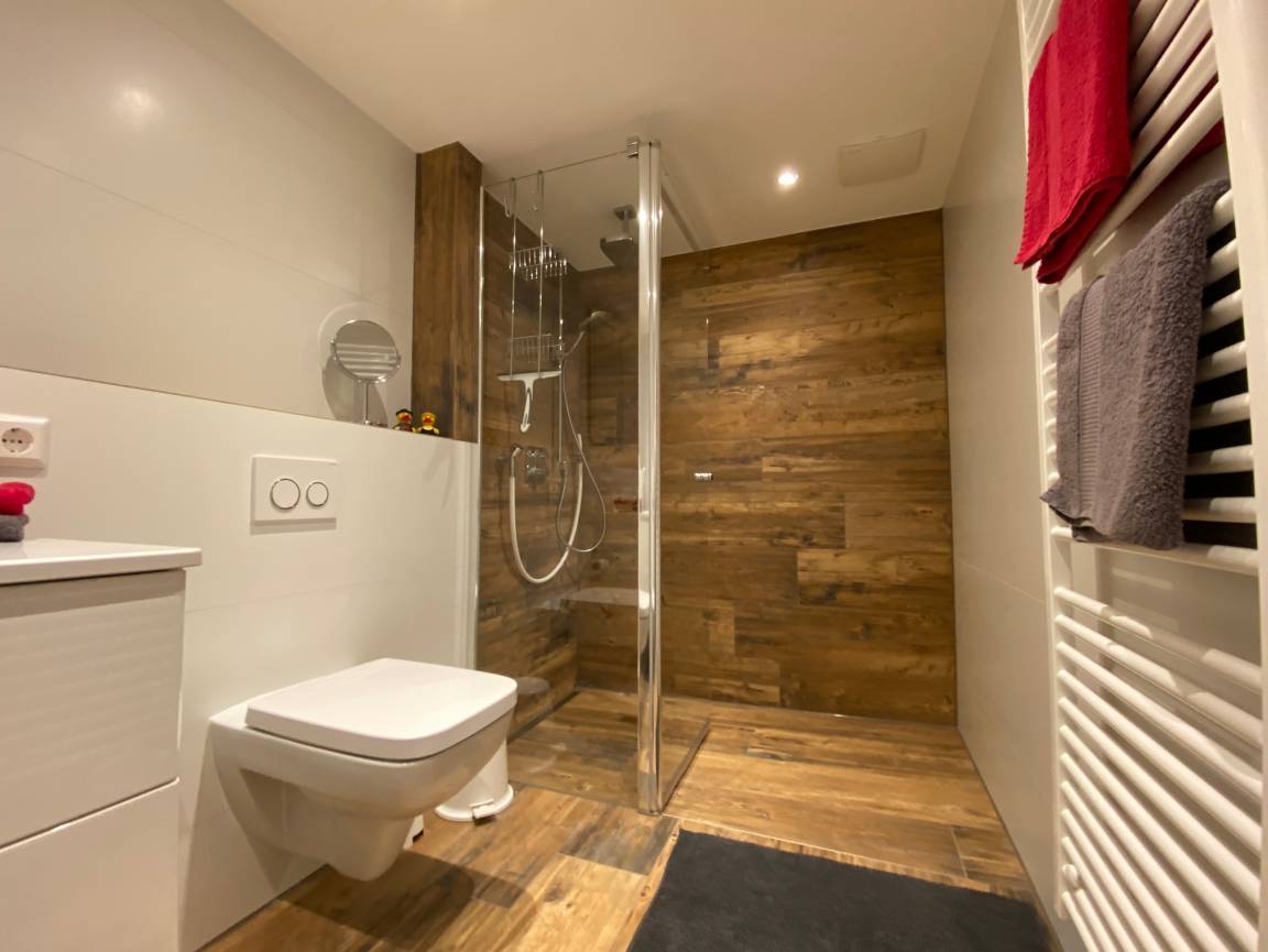 Die voll ausgestattete Wohnung inkl. Sauna in Alleinnutzung (die Saunanutzung ist bei einer Buchung von 4 - 7 Tagen einmal kostenfrei. Bei einem Aufenthalt von 14 Tagen ist die Sauna zweimal, bei 21 Tagen dreimal kostenfrei. Jede weitere Nutzung in der gebuchten Zeitspanne berechnen wir mit 25 Euro, die Bezahlung erfolgt nach Nutzungshäufigkeit vor Ort. Eine eigene Sonnenterasse bietet viel Raum zu entspannen und den Tag zu genießen. Der "Wellnessbereich" wurde Ende 2022 komplett neu gestaltet mit edlen Fliesen und einer begehbaren Brause- und Regendusche.