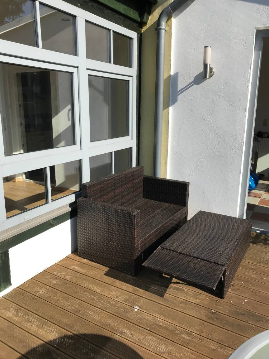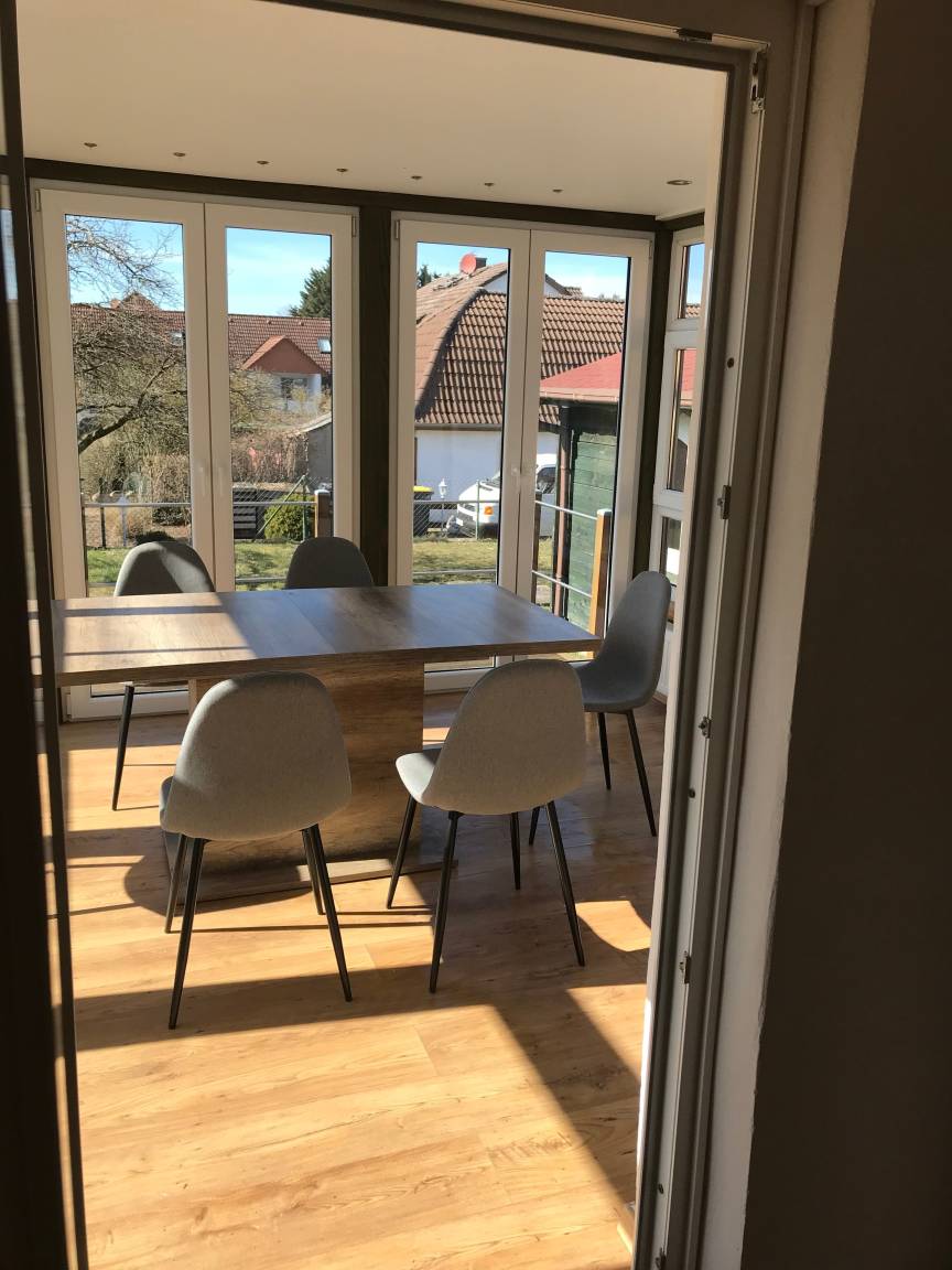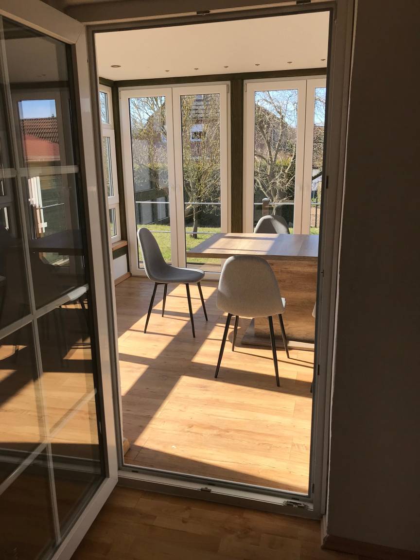 Das Haus ist nicht ebenerdig erreichbar, ein Absatz ist vorhanden, der für Rollstuhlfahrer leider ungeeignet ist. Im Haus befindet sich ein großer geräumiger Vorflur über den man die Wohnküche gelangt. Die voll ausgestattete Küche lädt zum Kochen und verweilen ein. Von der Küche gelangt man in den Wintergarten, der als Esszimmer fungiert. Ein großer Esstisch hält Platz für bis zu 8 Personen bereit.