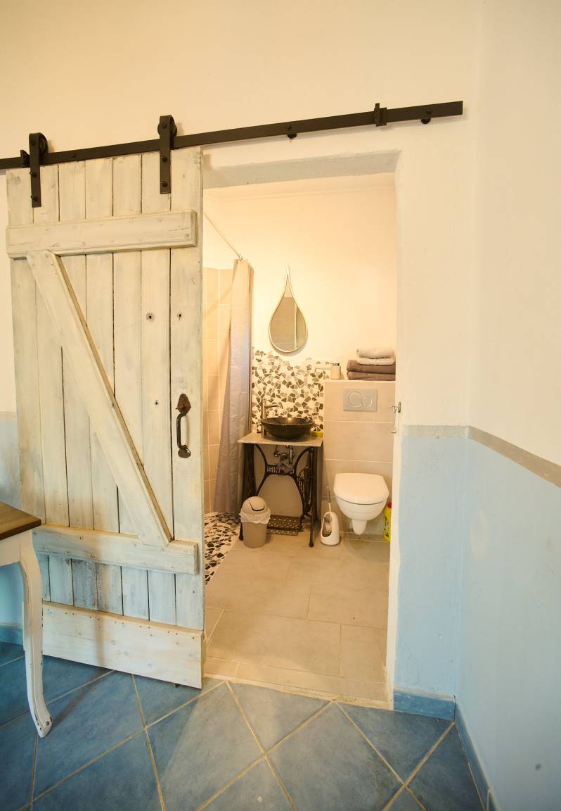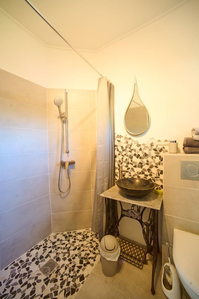 Badezimmer mit Dusche, Waschbecken und WC sehr originell gestaltet.