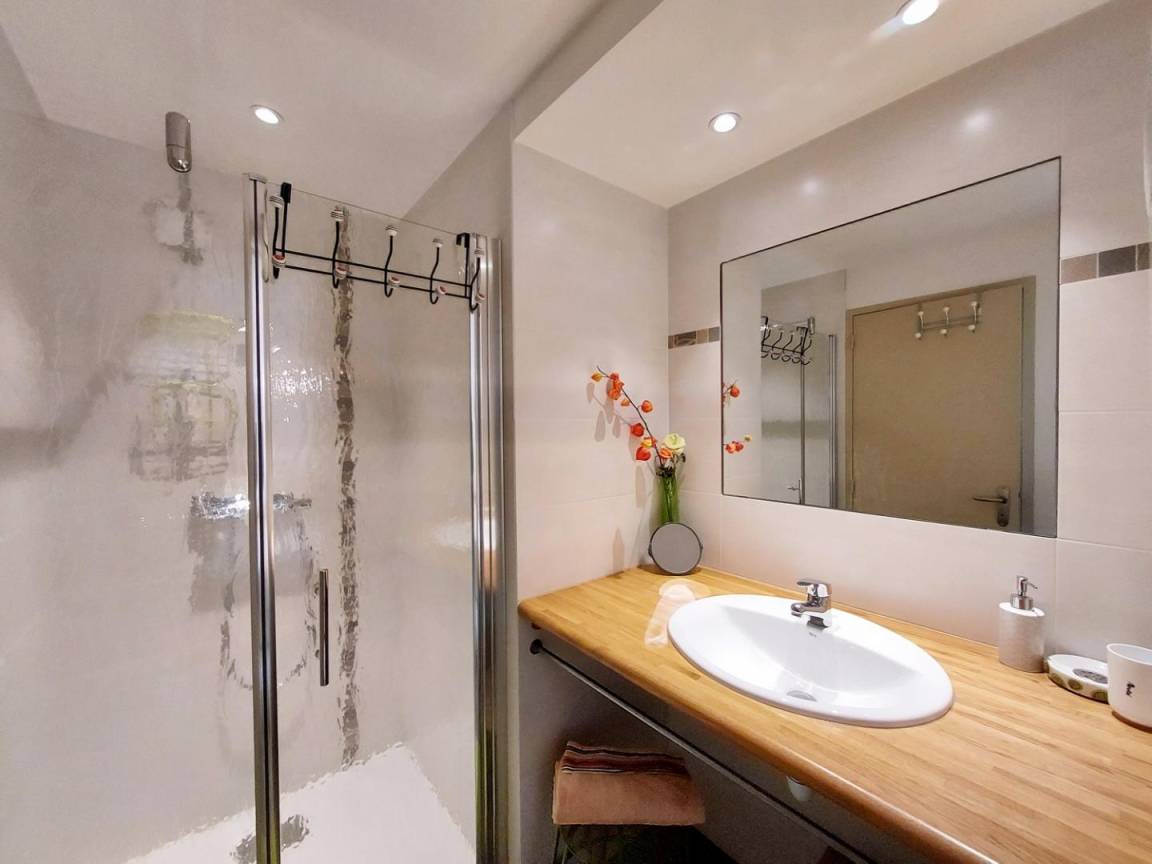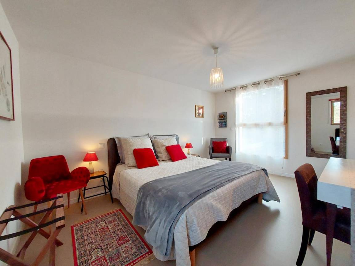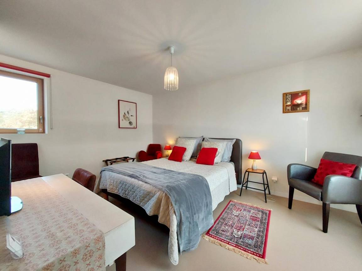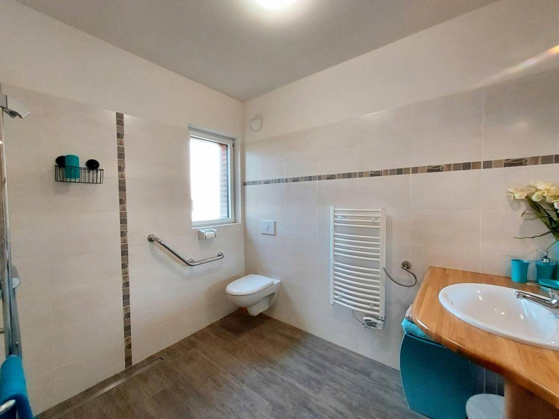 - eine Küche, ein Schlafzimmer (1 Bett 160 x 200, verstellbar auf 2 x 80) mit eigenem Bad/WC, zugänglich für Personen mit eingeschränkter Mobilität.
