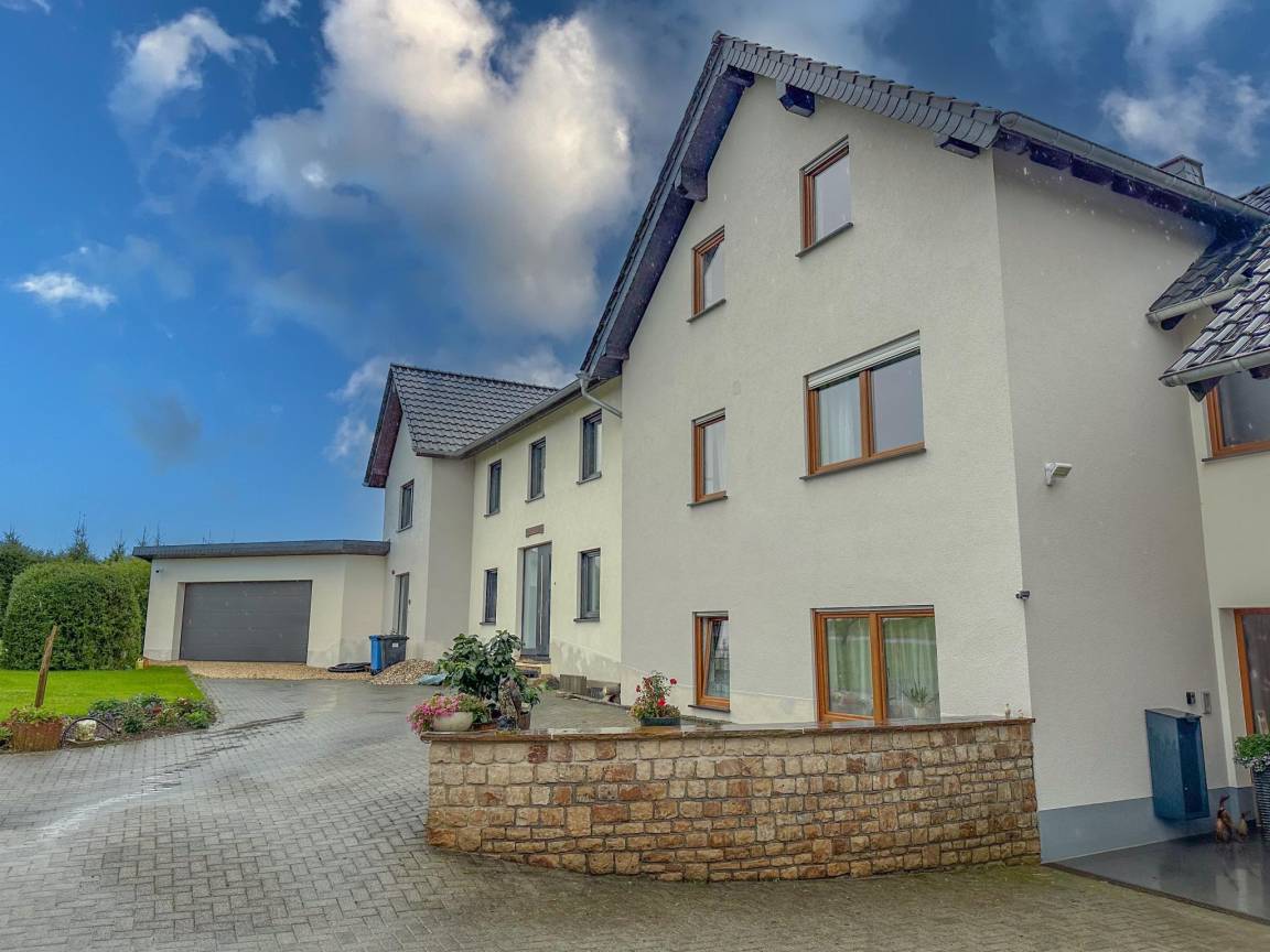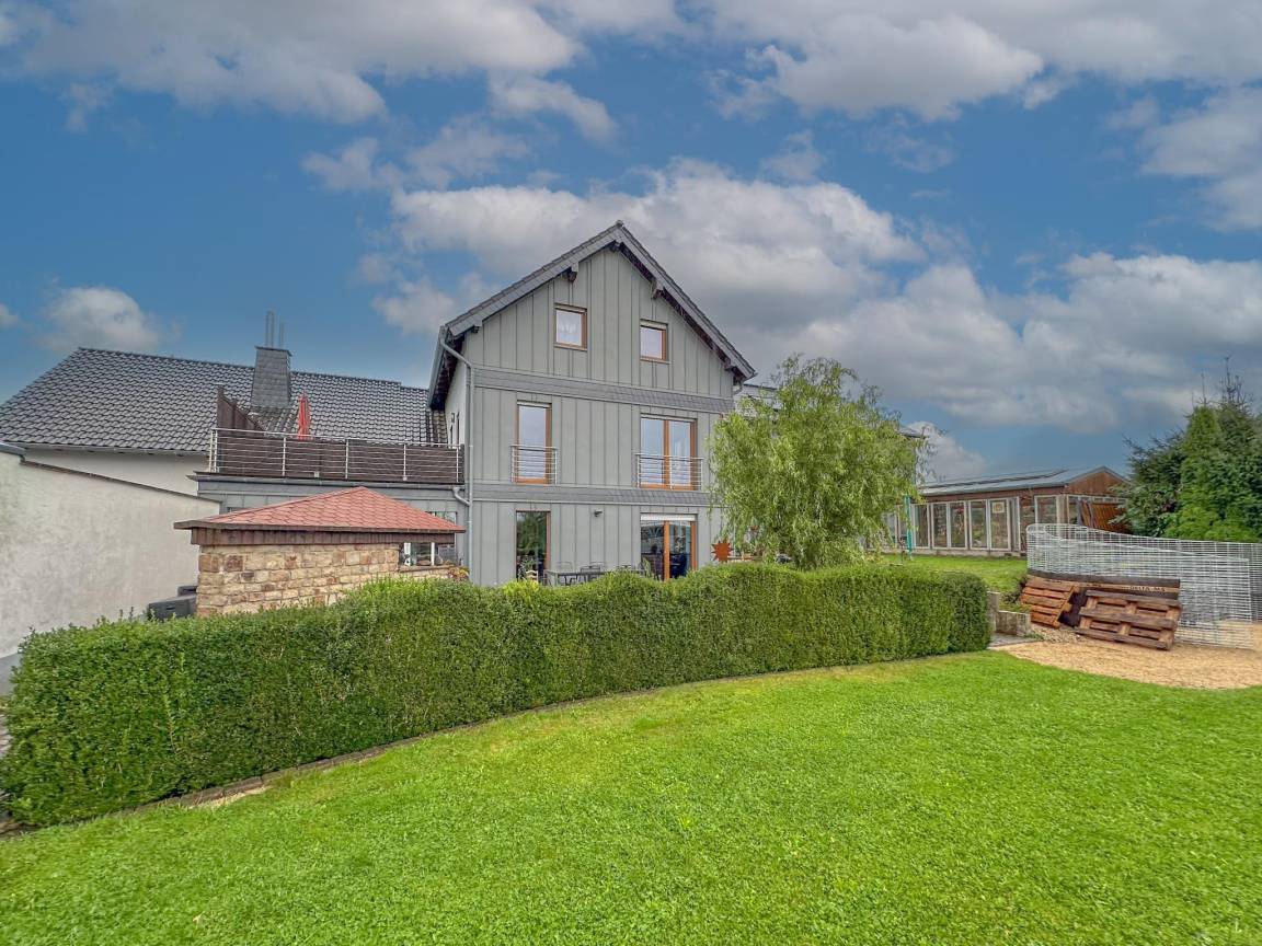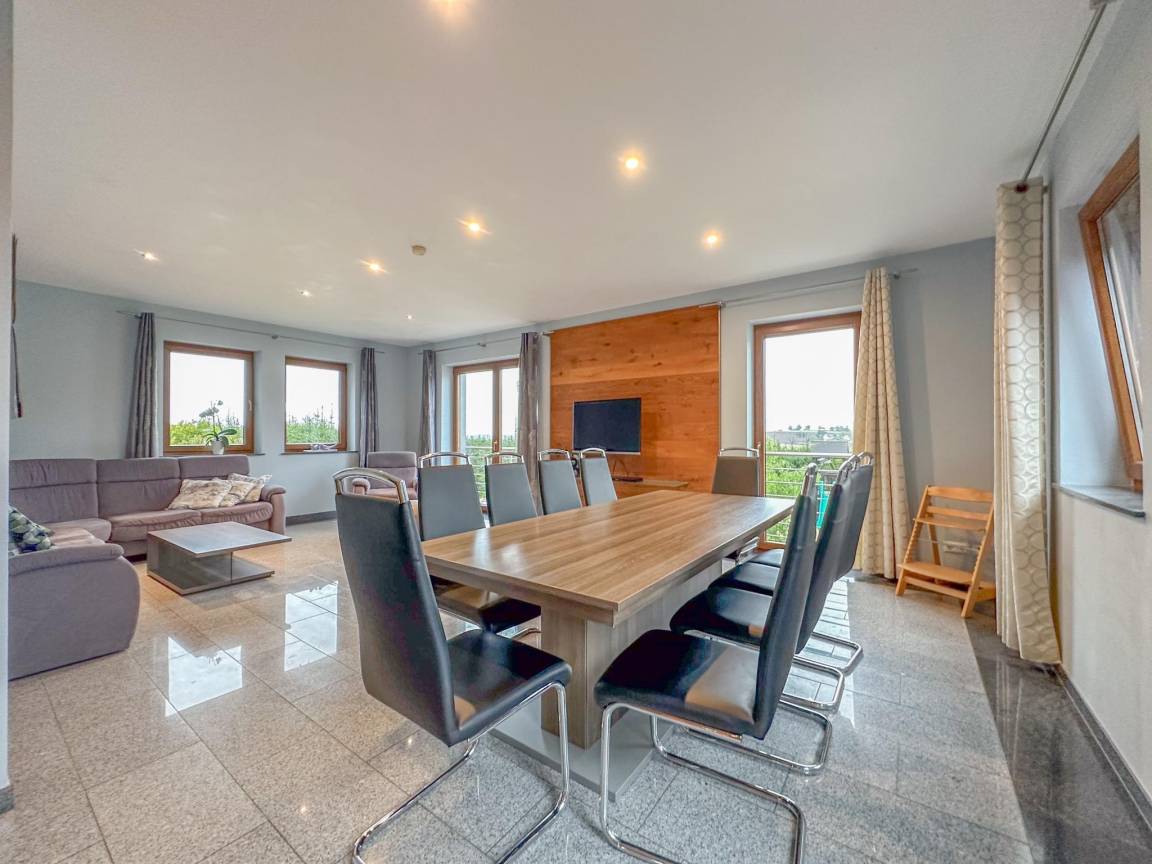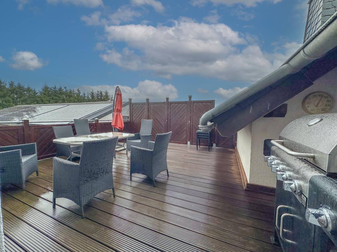Hausbeschreibung : Ruhige Lage und viel Platz für alle zeichnen dieses gemütliche Haus aus. Es ist die perfekte Wahl, wenn Sie eine gute Zeit mit einer Gruppe von Freunden oder der Familie verbringen möchten. Dank seiner Lage auf einer Anhöhe in einem naturreichen Gebiet im Weiler Feuerscheid können Sie eine schöne Aussicht genießen. Nicht allein innen gibt es Raum. Auf der Dachterrasse können Sie gemeinsam grillen. Oder geniessen Sie den großzügigen Garten mit Spielgeräten und Whirlpool (gegen Aufpreis)