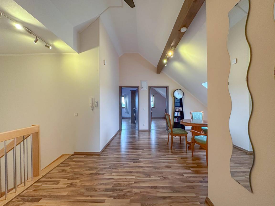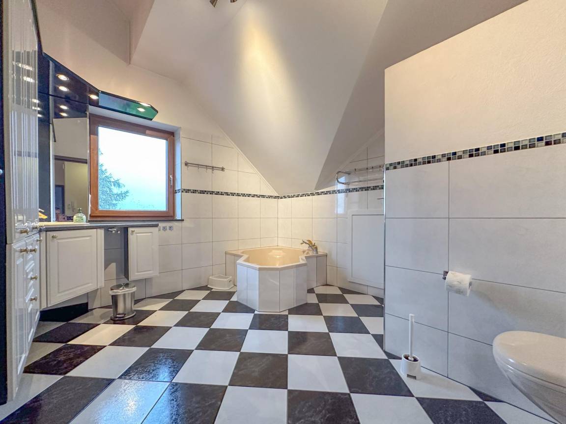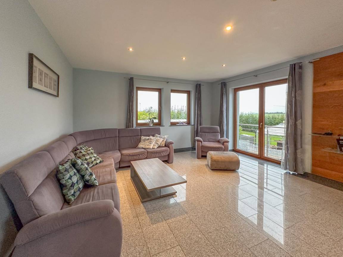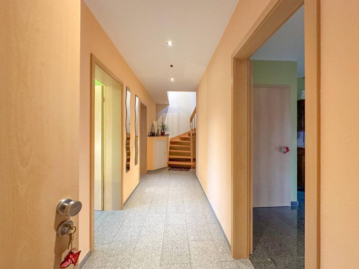 Hausbeschreibung : Ruhige Lage und viel Platz für alle zeichnen dieses gemütliche Haus aus. Es ist die perfekte Wahl, wenn Sie eine gute Zeit mit einer Gruppe von Freunden oder der Familie verbringen möchten. Dank seiner Lage auf einer Anhöhe in einem naturreichen Gebiet im Weiler Feuerscheid können Sie eine schöne Aussicht genießen. Nicht allein innen gibt es Raum. Auf der Dachterrasse können Sie gemeinsam grillen. Oder geniessen Sie den großzügigen Garten mit Spielgeräten und Whirlpool (gegen Aufpreis)