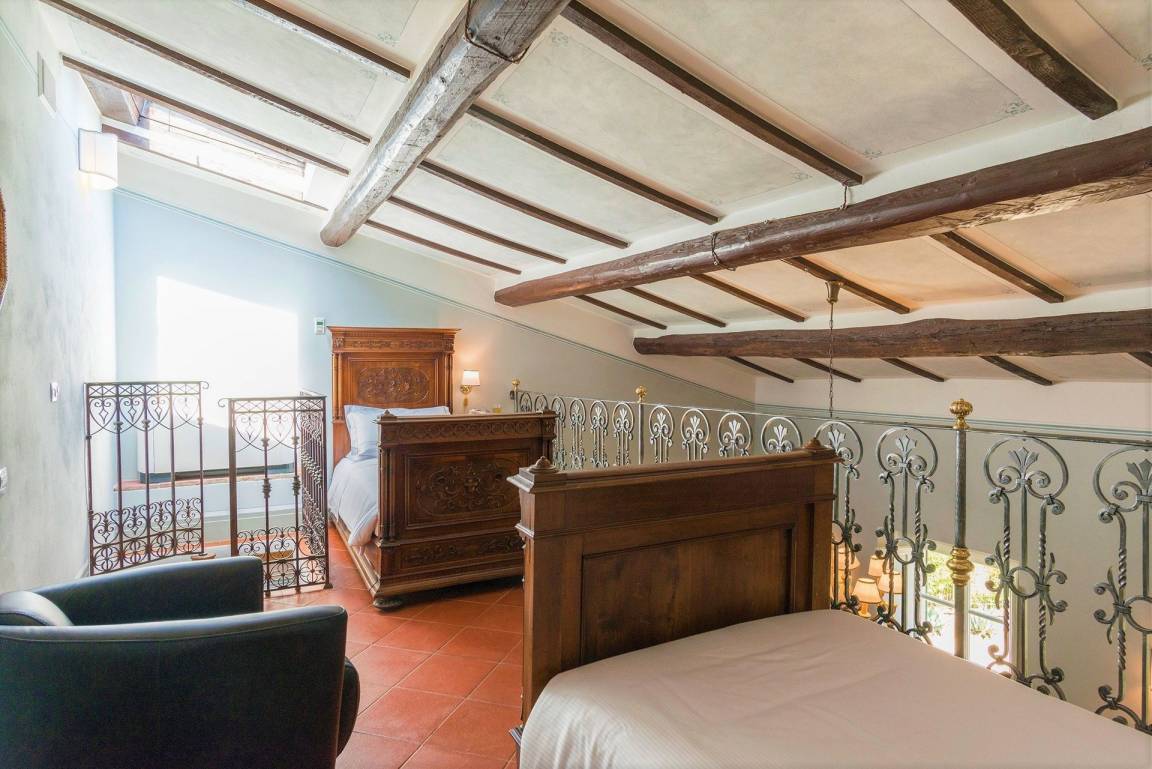 Schlafzimmer mit Bad 7: zwei Einzelbetten, WiFi Internet, Internet, Klimaanlage, zwei Sessel, Waschbecken, WC, Dusche, Fön, Galerie.