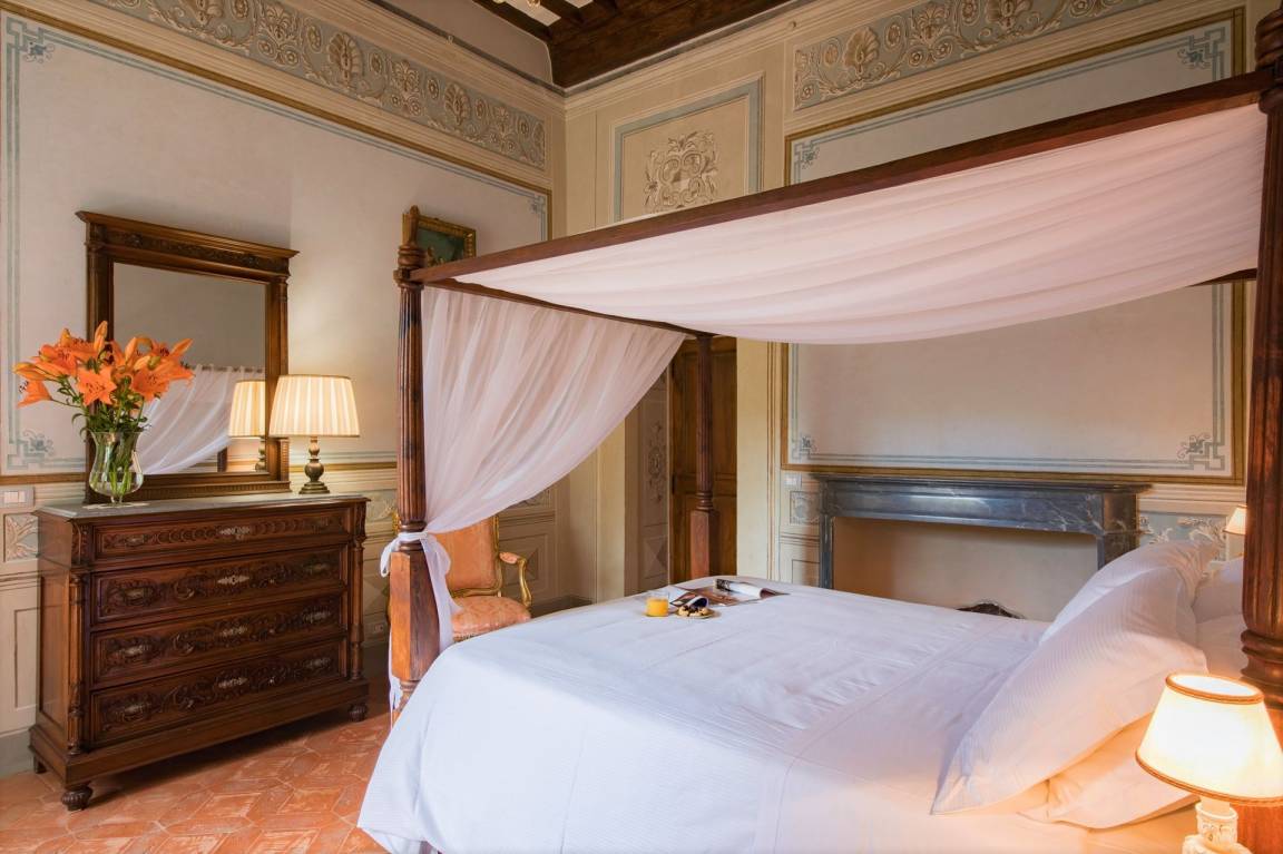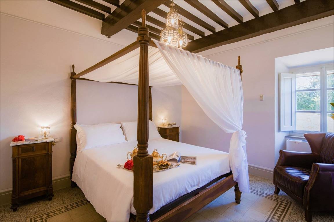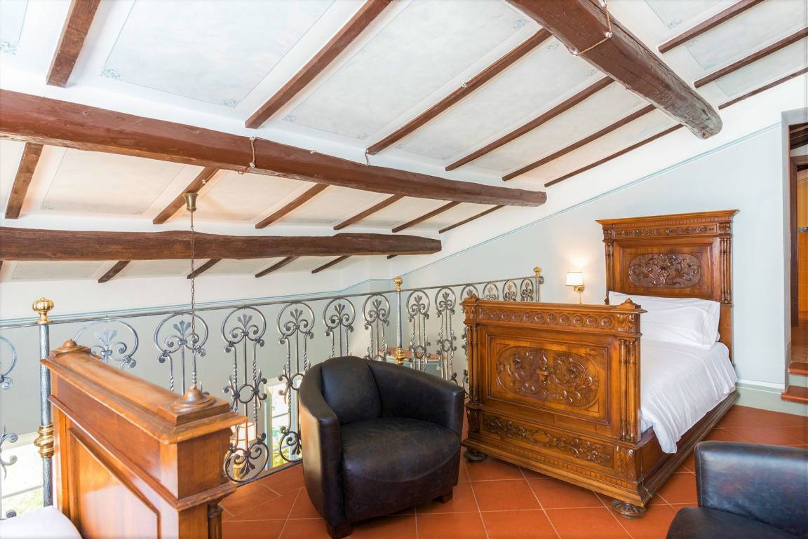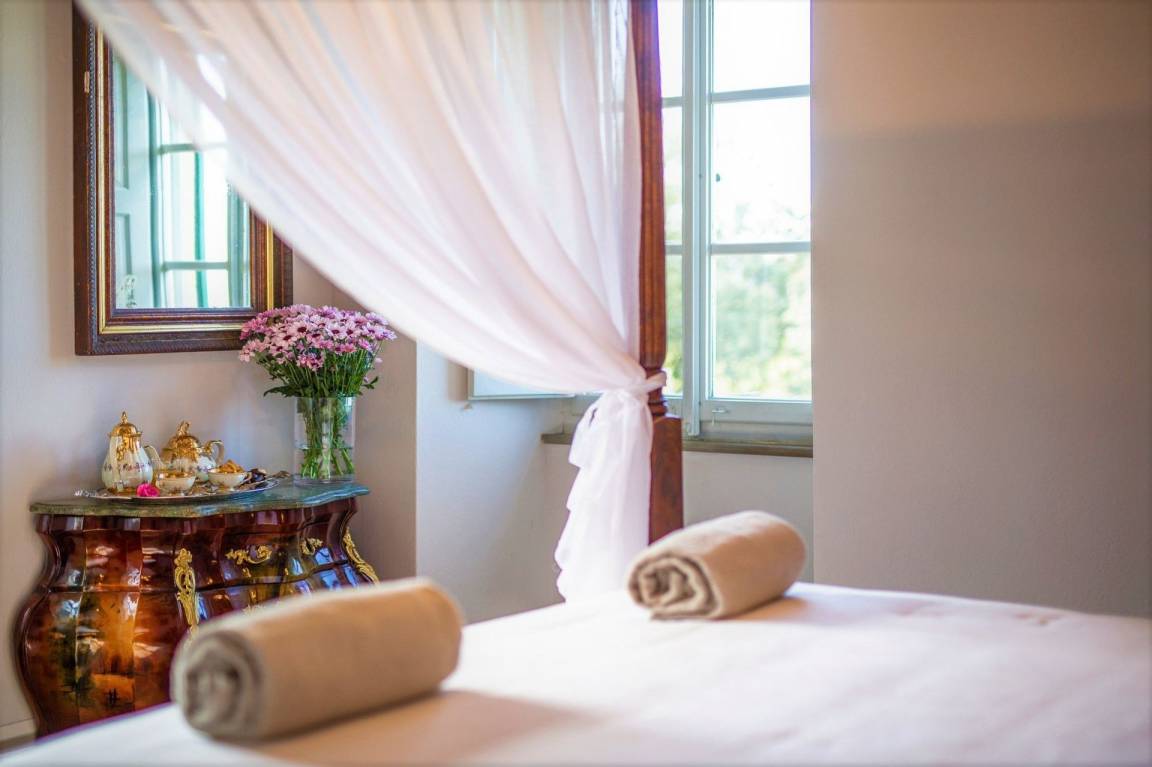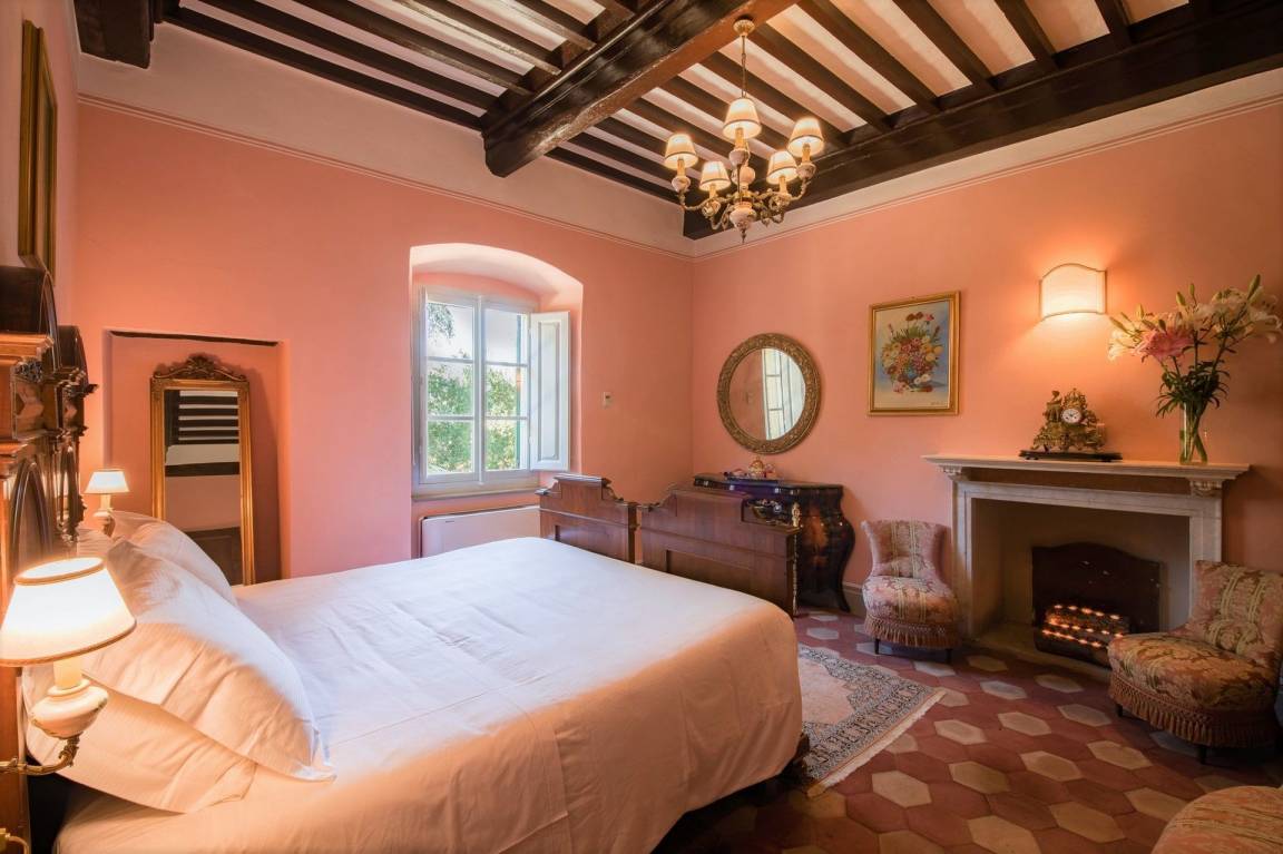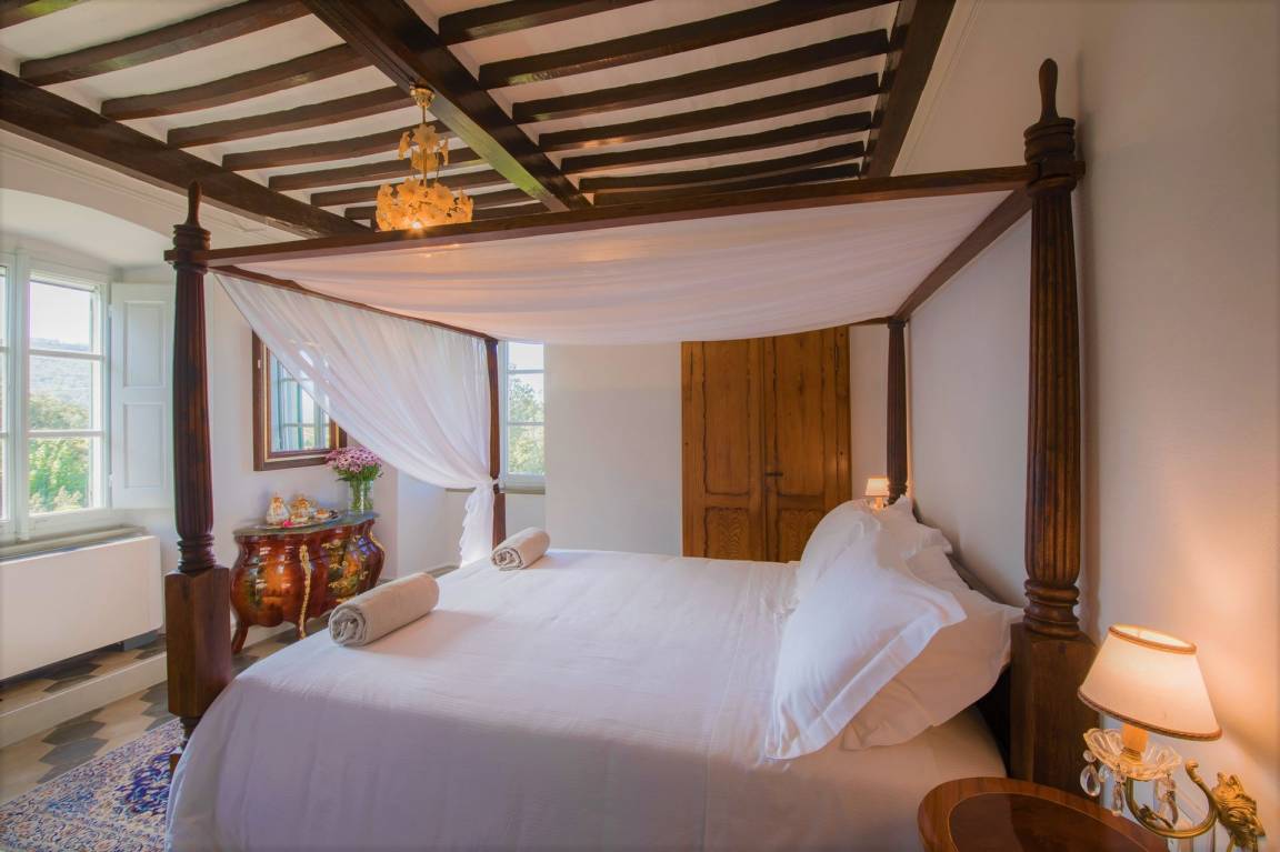 Schlafzimmer mit Bad 5: großes Doppelbett (Breite: 165m, Länge: 200m), WiFi Internet, Internet, Klimaanlage, Fliegengitter, Satelliten-TV, TV, Sofa, zwei Sessel, Kamin, Waschbecken, WC, Bidet, Dusche, Fön.