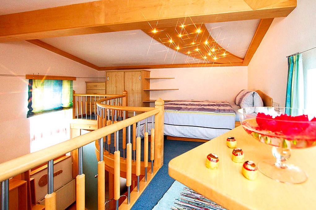A 376.15 Ferienhaus 1-3 Pers.: Freundliches 1 -Zimmerhaus mit 45 qm Wohnfläche über 2 Etagen. Parterre: Großzügiger Wohn-/Essraum mit Couchgarnitur (Ausziehcouch 1 Pers.), Sat-TV, Esstisch, thekenartig abgetrennter Einbauküche (Backofen, Mikrowelle). Bad: Du, Wb. Separates WC. Vom Wohnraum Treppe auf die offene Galerie: Doppelbett unter beleuchtetem Sternenhimmel. Großzügige Terrasse mit Sitzmöbeln.