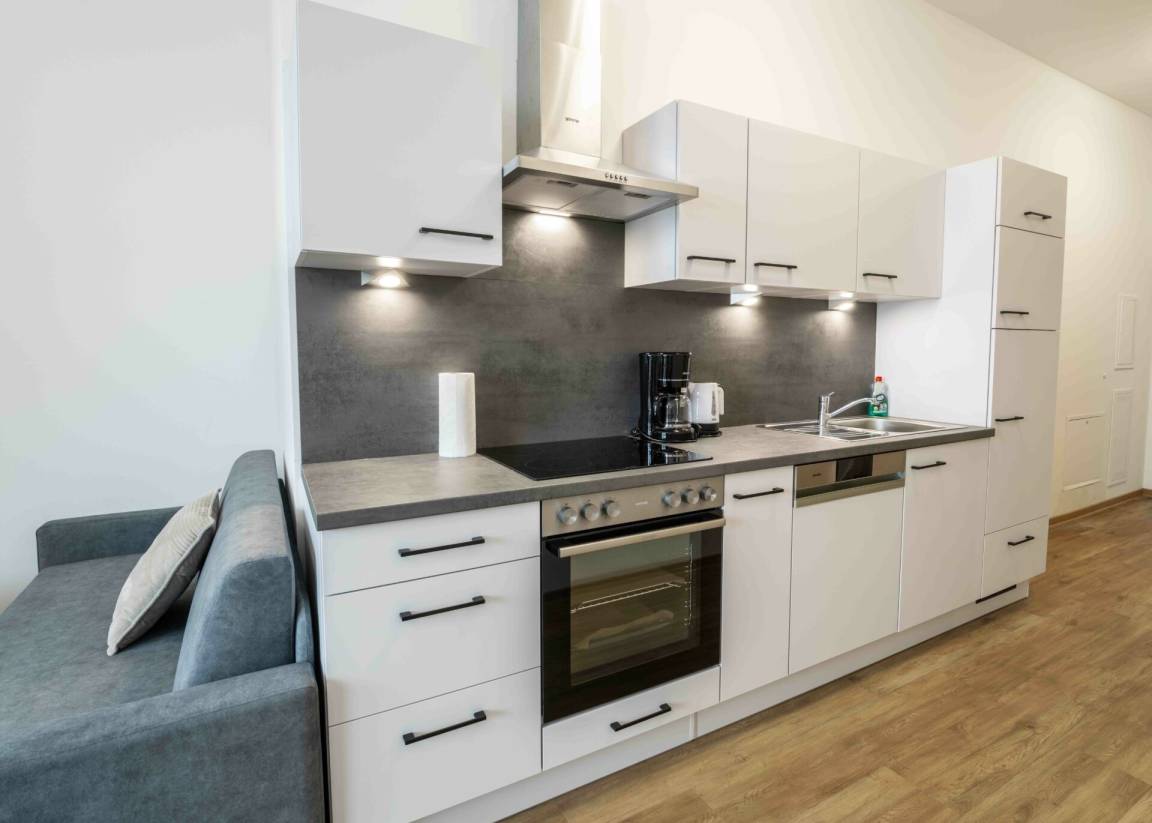 Die Wohnung ist mit einer Fußbodenheizung ausgestattet, die Küche ist komplett eingerichtet und der Wohnbereich verfügt über ein Sofa und einen Flachbildfernseher.