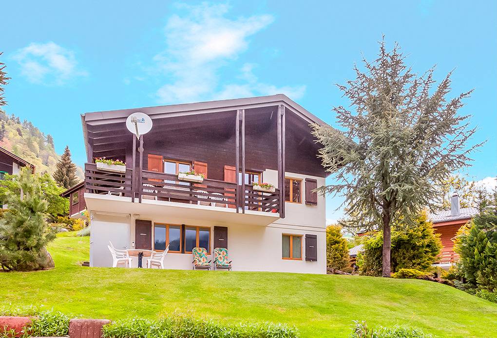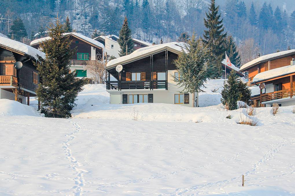 Ort: Fiesch. Freistehend in einer Chaletsiedlung oberhalb des Ortes. Ruhige Hanglage mit schönem Panoramablick auf die umliegende Bergwelt. Bei guter Schneelage Skiabfahrt über Skiroute bis in Hausnähe. Gondel Fiesch 600 m Fußweg, mit dem Pkw 2,3 km. Ortsmitte 1,8 km.
