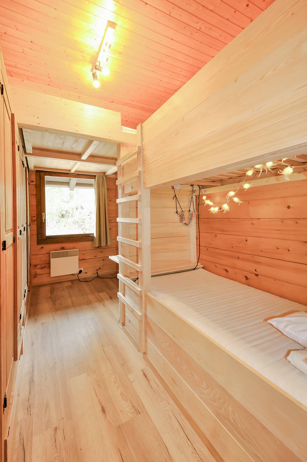 1. Etage: Schöner Küchen-/Essraum mit großem Esstisch, TV, kleiner Esstheke, moderner Einbauküche (Backofen, Gefrierschrank, Spülmaschine), Balkon. Vom Wohnraum steile Leiter zur Schlafkoje (Doppelmatratze, keine Stehhöhe). Doppelzimmer mit Doppelbett. 4-Bettzimmer mit Etagenbett, Hochbett (2 Pers.). Bad: Bw/Du, Wb, WC.
