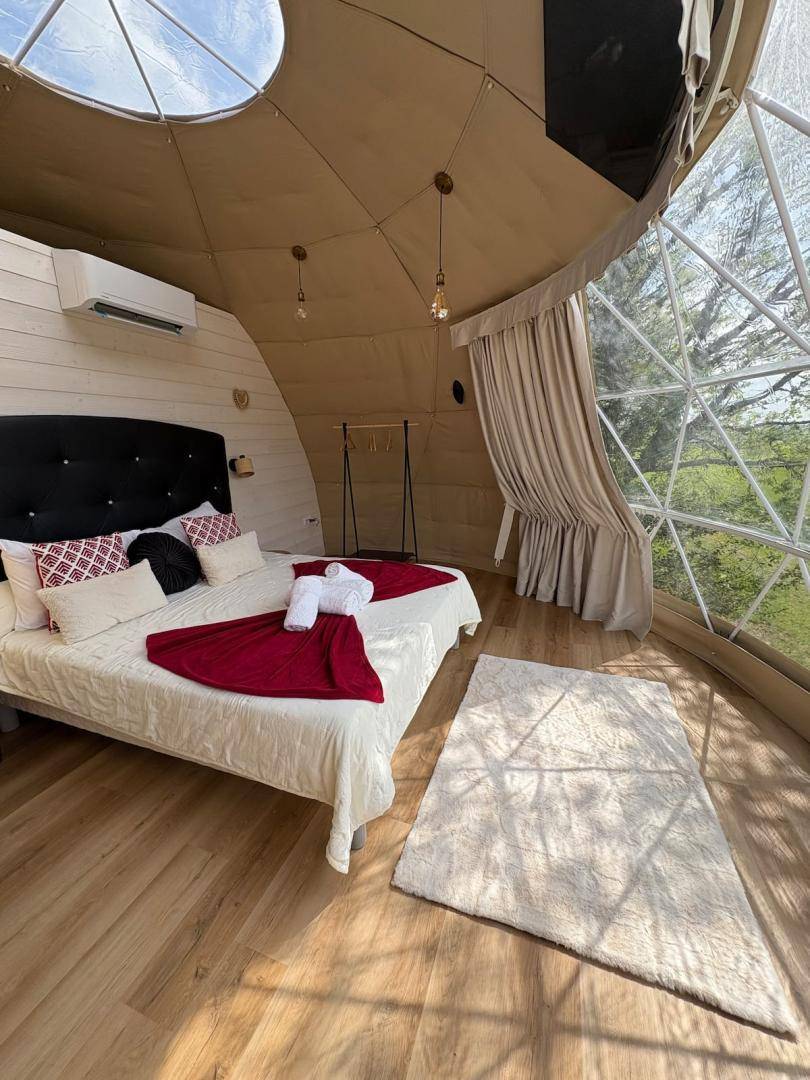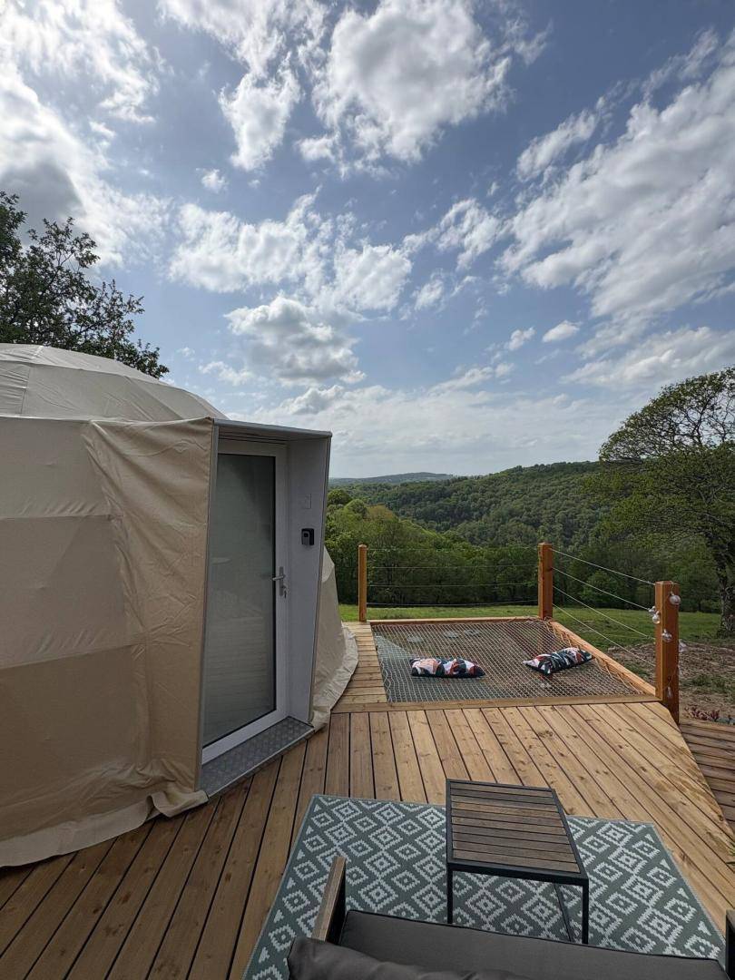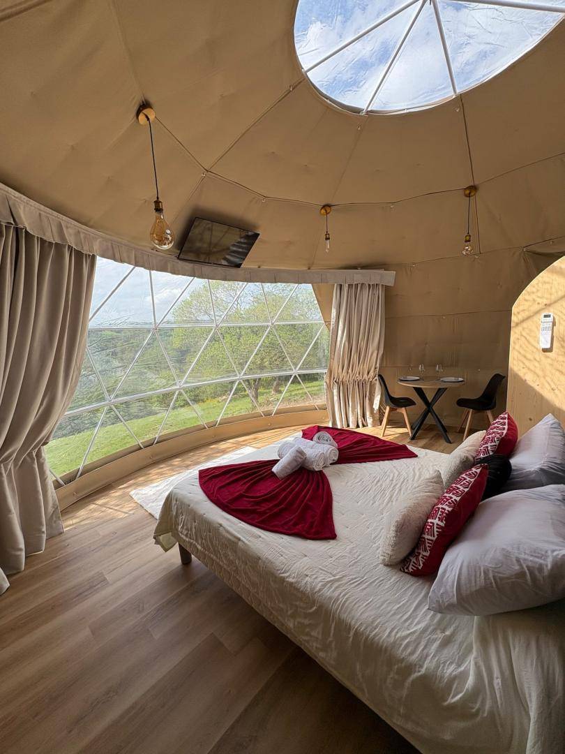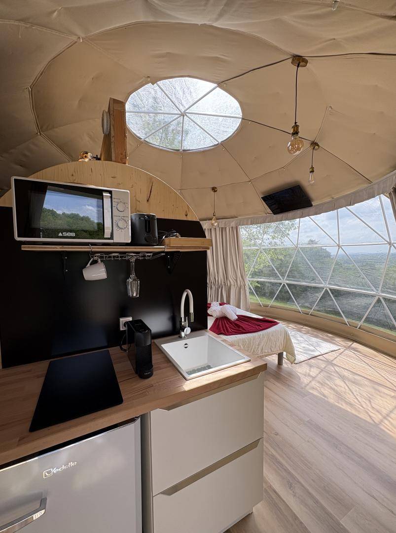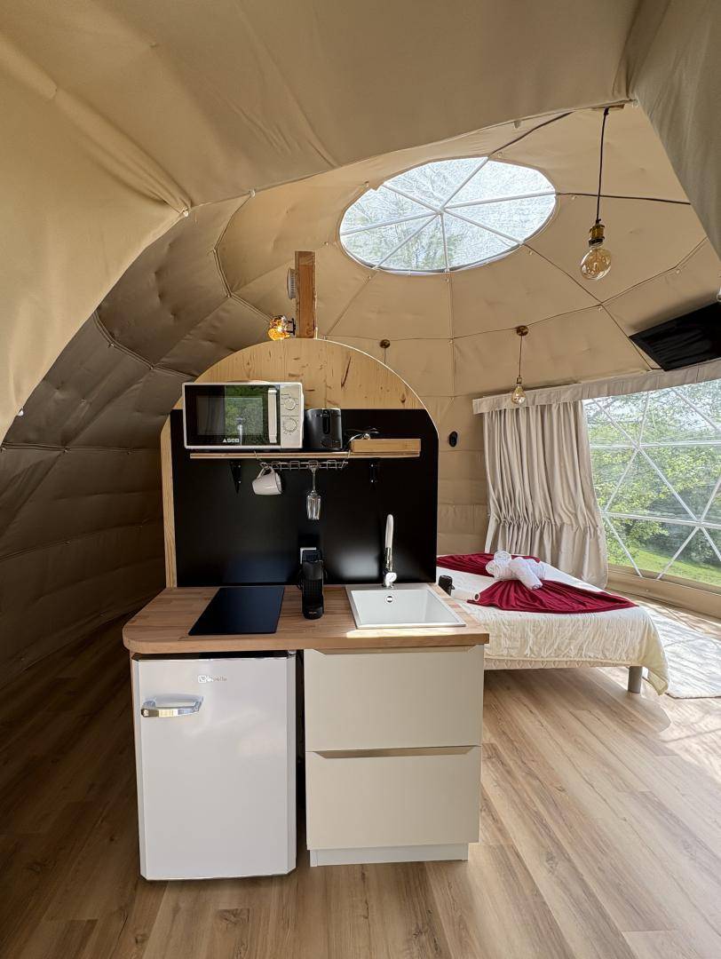 „Séjour très agréable. Dôme impeccable, propre et joliment décoré. Ce n'est par contre pas la meilleure formule pour un week-end de canicule car situé en plein soleil et la clim n'est pas assez puissante. Il manque aussi un parasol en extérieur. Mais ce ne sont que des détails. Coucher de soleil magnifique.“