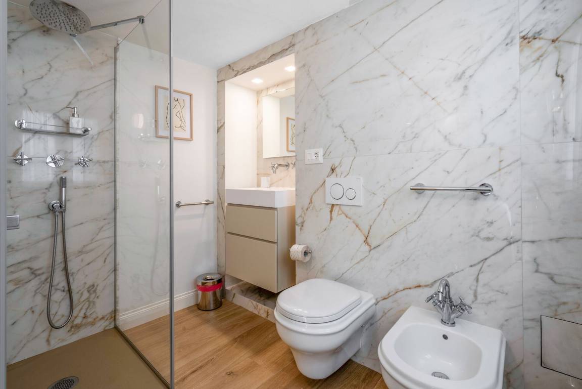 Badezimmer: Waschbecken, WC, Bidet, Dusche, Fön.