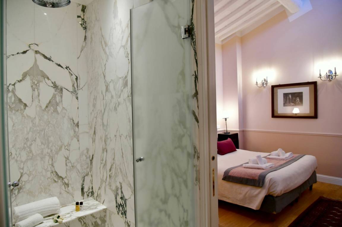 Schlafzimmer mit Bad: Doppelbett (Breite: 160m, Länge: 200m), WiFi Internet, Klimaanlage, Schreibtisch, Safe, Waschbecken, WC, Bidet, Dusche, Fön.