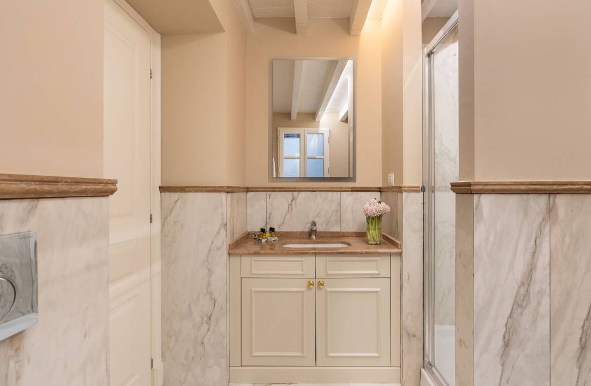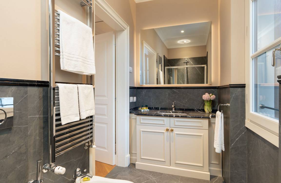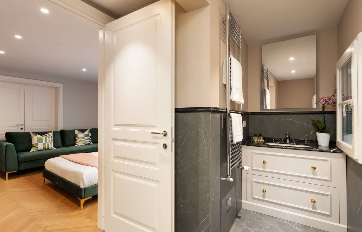 Schlafzimmer mit Bad 4: Doppelbett, WiFi Internet, Klimaanlage, Satelliten-TV, Waschbecken, WC, Bidet, Dusche.