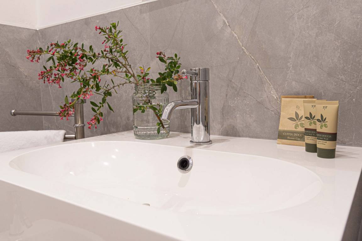 Badezimmer: Waschbecken, WC, Bidet, Dusche, Fön, WiFi Internet.