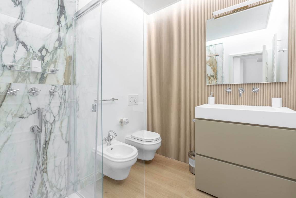 Badezimmer: Waschbecken, WC, Bidet, Dusche, Fön, WiFi Internet.