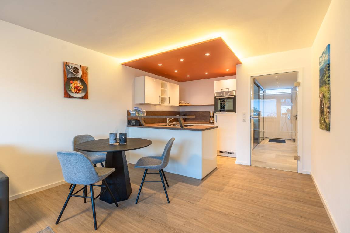 Die Wohnung verfügt über einen großen hellen Wohnraum mit Panoramafenstern, Schlafcouch für 2 Personen, eine hochwertige Küche und eine gemütliche Essgruppe.