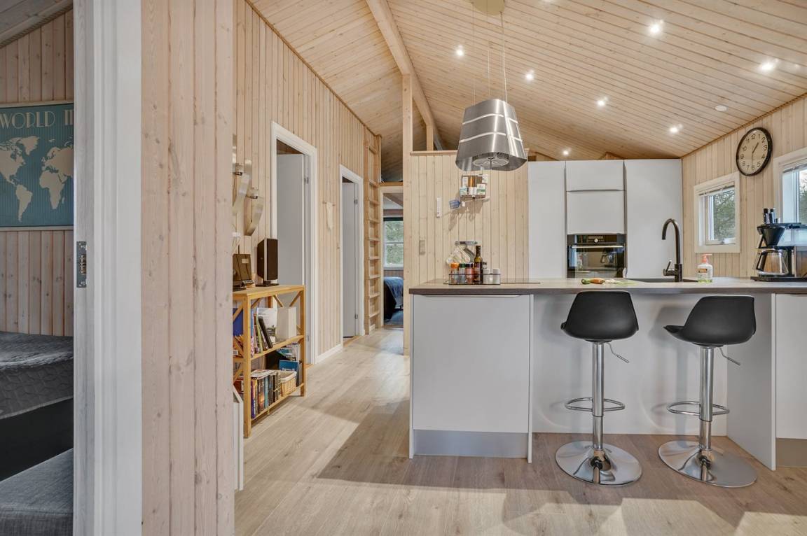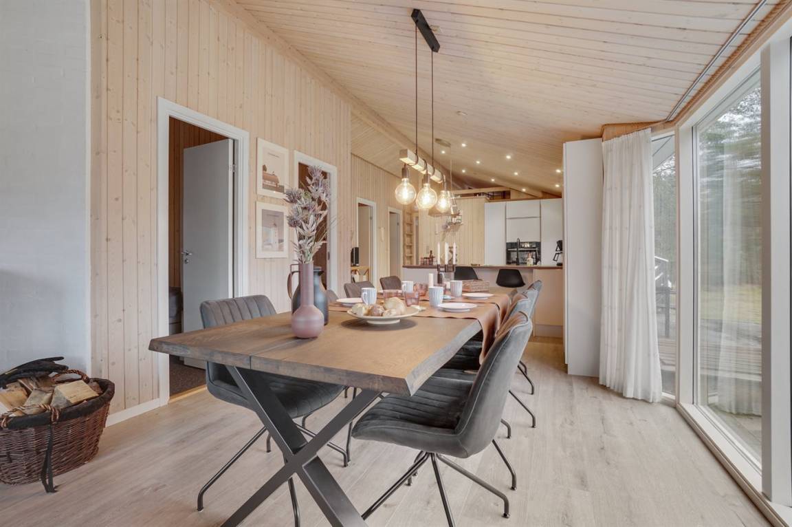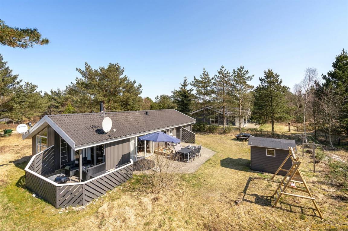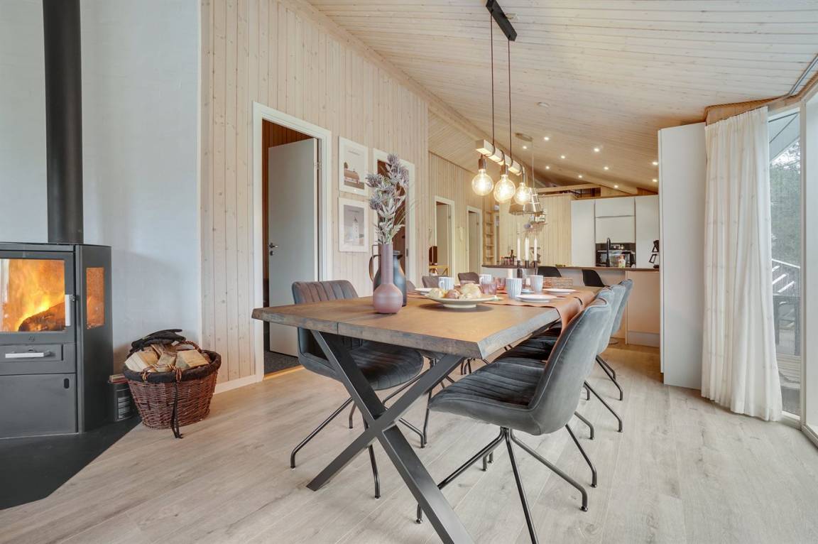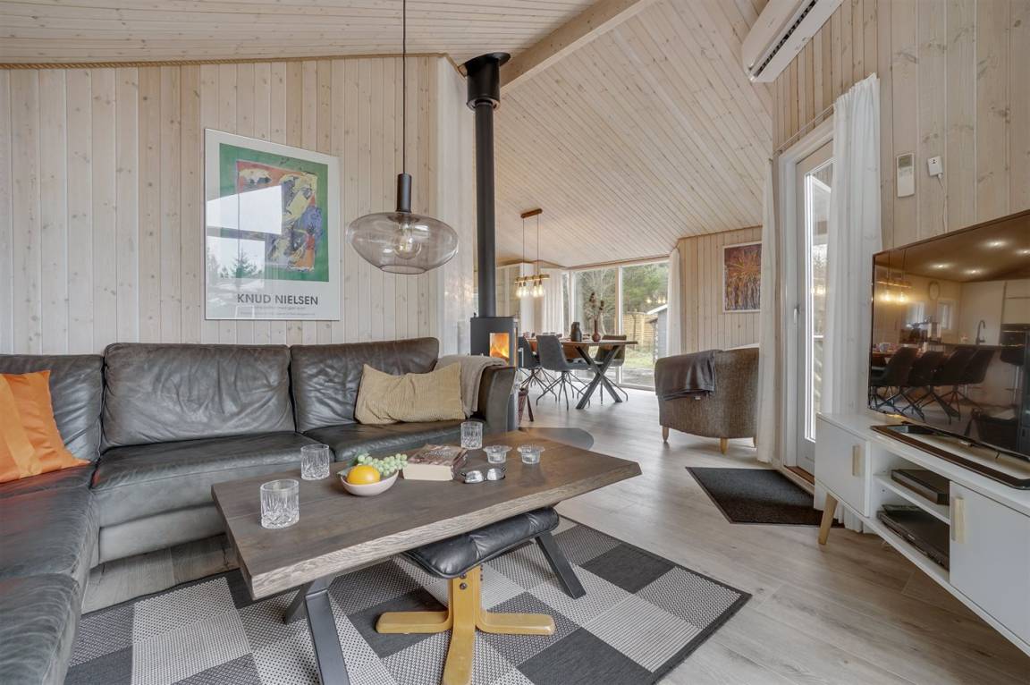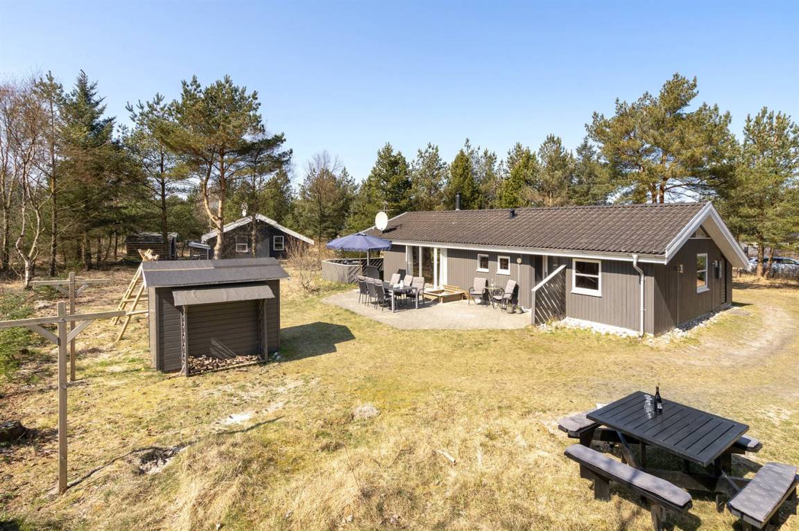 Ein wirklich schönes, gut ausgestattetes Ferienhaus, 2000 gebaut und laufend renoviert. Offene sowohl als überdachte Terrasse mit netten Gartenmöbeln. Innen sind Wände und Decken mit hellem Holz verkleidet, Holzboden in dem Wohnzimmer und Teppichboden in den Zimmern. 2 schöne Badezimmer mit Duschnische und Fußbodenheizung; das eine Badezimmer hat ebenfalls einen schönen 2-Pers.-Whirlpool und Zugang zur Sauna. Die Küche ist mit dem Wohnzimmer kombiniert und enthält u. a. Herd mit Ceran-Feld, Umluftofen, Tiefkühlgerät, Mikrowelle und Geschirrspüler. Schönes, großes Wohnzimmer mit Kaminofen, TV mit digitalem Satellitenanschluss, Video, DVD-Spieler und Stereoanlage mit CD-Spieler. Kostenlose ADSL-Internetverbindung (eigener Computer muss mitgebracht werden). Offenes Obergeschoss mit TV für Spiele. Das Haus ist mit 4 Schlafzimmer eingerichtet: 2 mit Doppelbett und 2 mit je 2 Einzelbetten. Ferner gibt es 2 Schlafplätze auf Matratzen im offenen Obergeschoss. An weiterer Ausstattung können Waschmaschine, Wäschetrockner und 2 zusätzliche TV's erwähnt werden. Für die kleinen Feriengäste stehen Schaukel, Sandkasten, Kinderbett und Kinderhochstuhl zur Verfügung. Das Haus ist ein besonders schönes Ferienhaus für sowohl 1 als auch 2 Familien. Das naturschöne Gebiet bietet viele Möglichkeiten für Wanderungen in der großartigen Natur entweder im Waldgebiet oder beim Meer, wo Sie abends die Fischer arbeiten sehen können. Es gibt besonders gute Bade- und Angelmöglichkeiten im Gehabstand vom Haus. In der nah gelegenen Stadt Fjerritslev gibt es viele Aktivitätsmöglichkeiten, u. a. Schwimmhalle, Bowling oder Shopping.