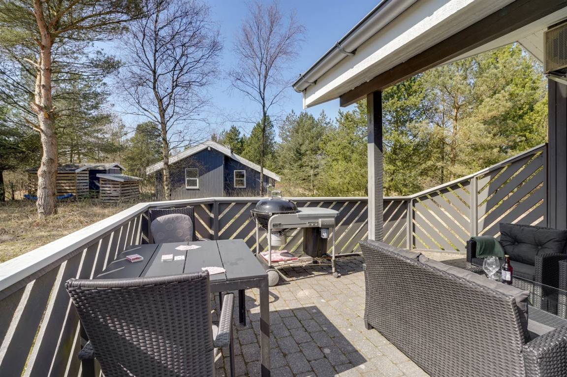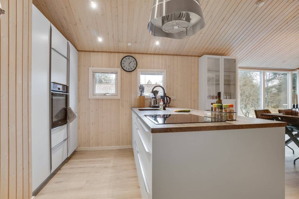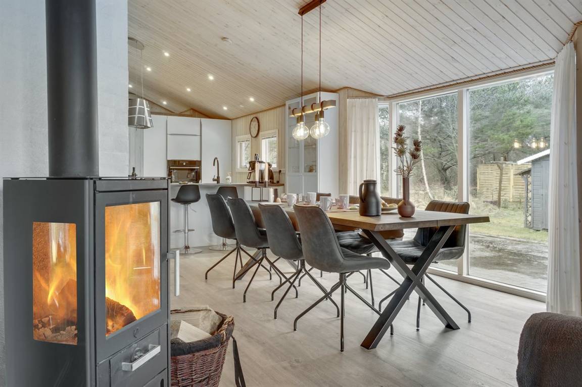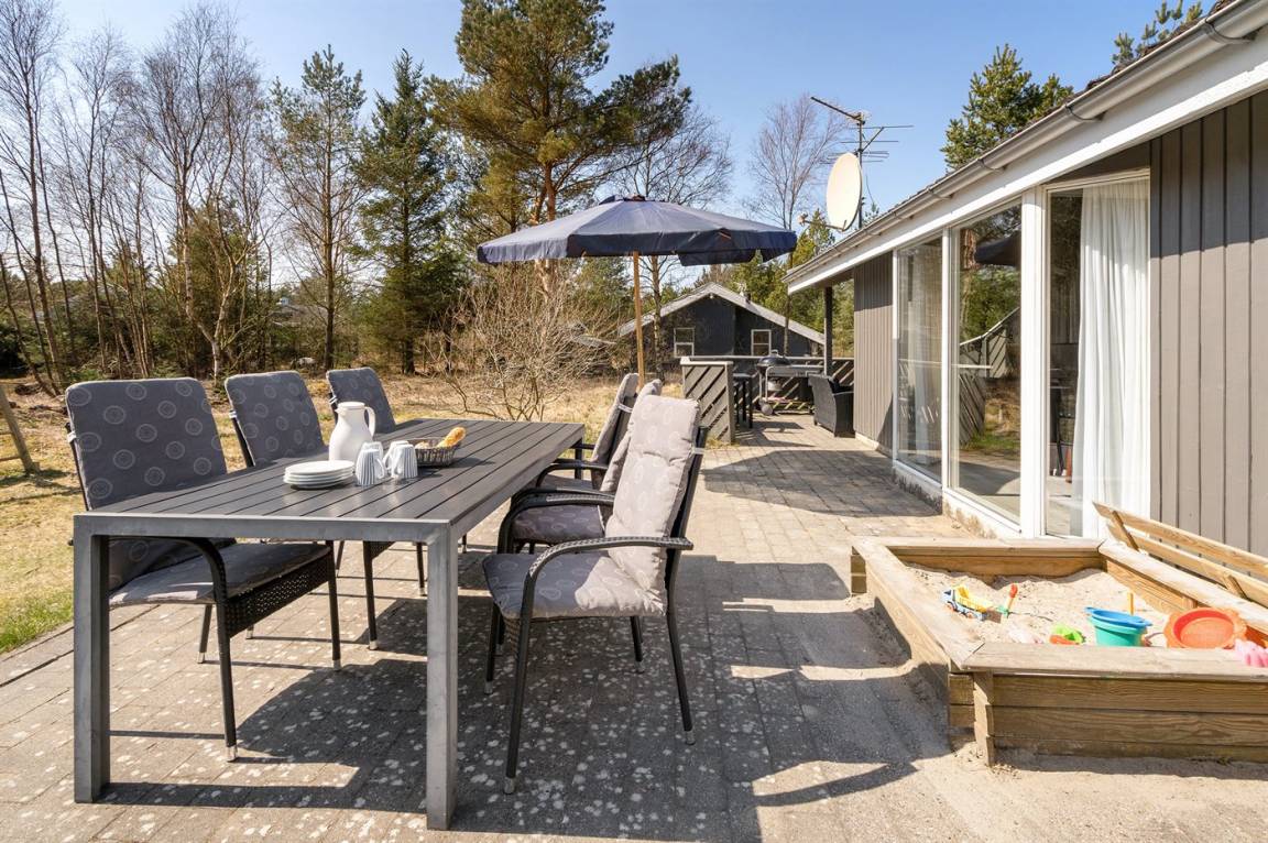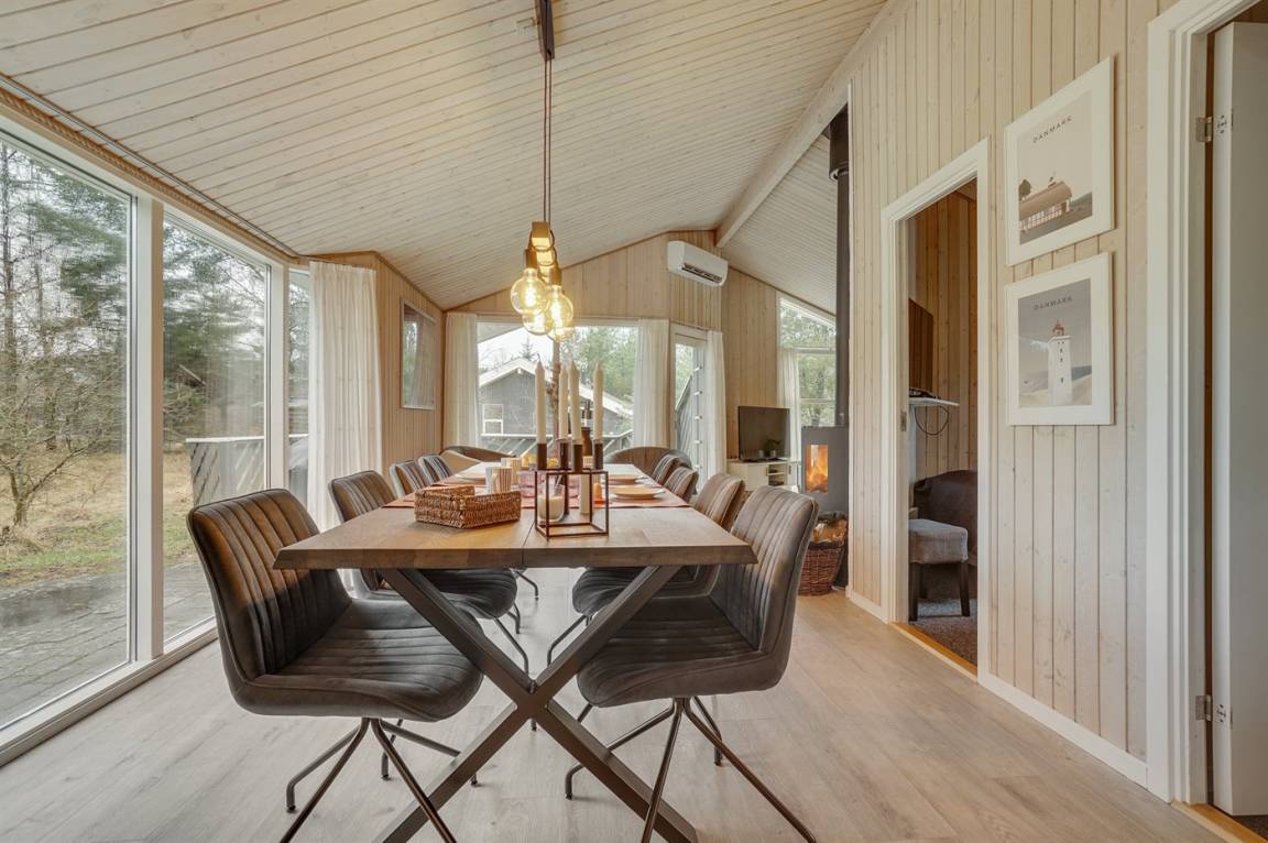 Ein wirklich schönes, gut ausgestattetes Ferienhaus, 2000 gebaut und laufend renoviert. Offene sowohl als überdachte Terrasse mit netten Gartenmöbeln. Innen sind Wände und Decken mit hellem Holz verkleidet, Holzboden in dem Wohnzimmer und Teppichboden in den Zimmern. 2 schöne Badezimmer mit Duschnische und Fußbodenheizung; das eine Badezimmer hat ebenfalls einen schönen 2-Pers.-Whirlpool und Zugang zur Sauna. Die Küche ist mit dem Wohnzimmer kombiniert und enthält u. a. Herd mit Ceran-Feld, Umluftofen, Tiefkühlgerät, Mikrowelle und Geschirrspüler. Schönes, großes Wohnzimmer mit Kaminofen, TV mit digitalem Satellitenanschluss, Video, DVD-Spieler und Stereoanlage mit CD-Spieler. Kostenlose ADSL-Internetverbindung (eigener Computer muss mitgebracht werden). Offenes Obergeschoss mit TV für Spiele. Das Haus ist mit 4 Schlafzimmer eingerichtet: 2 mit Doppelbett und 2 mit je 2 Einzelbetten. Ferner gibt es 2 Schlafplätze auf Matratzen im offenen Obergeschoss. An weiterer Ausstattung können Waschmaschine, Wäschetrockner und 2 zusätzliche TV's erwähnt werden. Für die kleinen Feriengäste stehen Schaukel, Sandkasten, Kinderbett und Kinderhochstuhl zur Verfügung. Das Haus ist ein besonders schönes Ferienhaus für sowohl 1 als auch 2 Familien. Das naturschöne Gebiet bietet viele Möglichkeiten für Wanderungen in der großartigen Natur entweder im Waldgebiet oder beim Meer, wo Sie abends die Fischer arbeiten sehen können. Es gibt besonders gute Bade- und Angelmöglichkeiten im Gehabstand vom Haus. In der nah gelegenen Stadt Fjerritslev gibt es viele Aktivitätsmöglichkeiten, u. a. Schwimmhalle, Bowling oder Shopping.