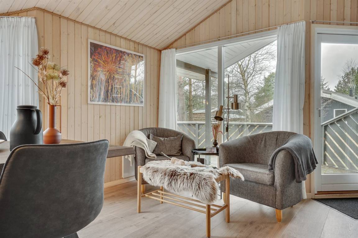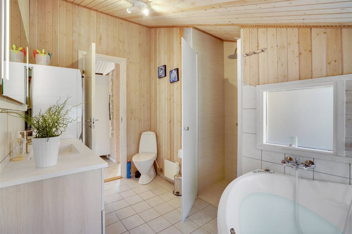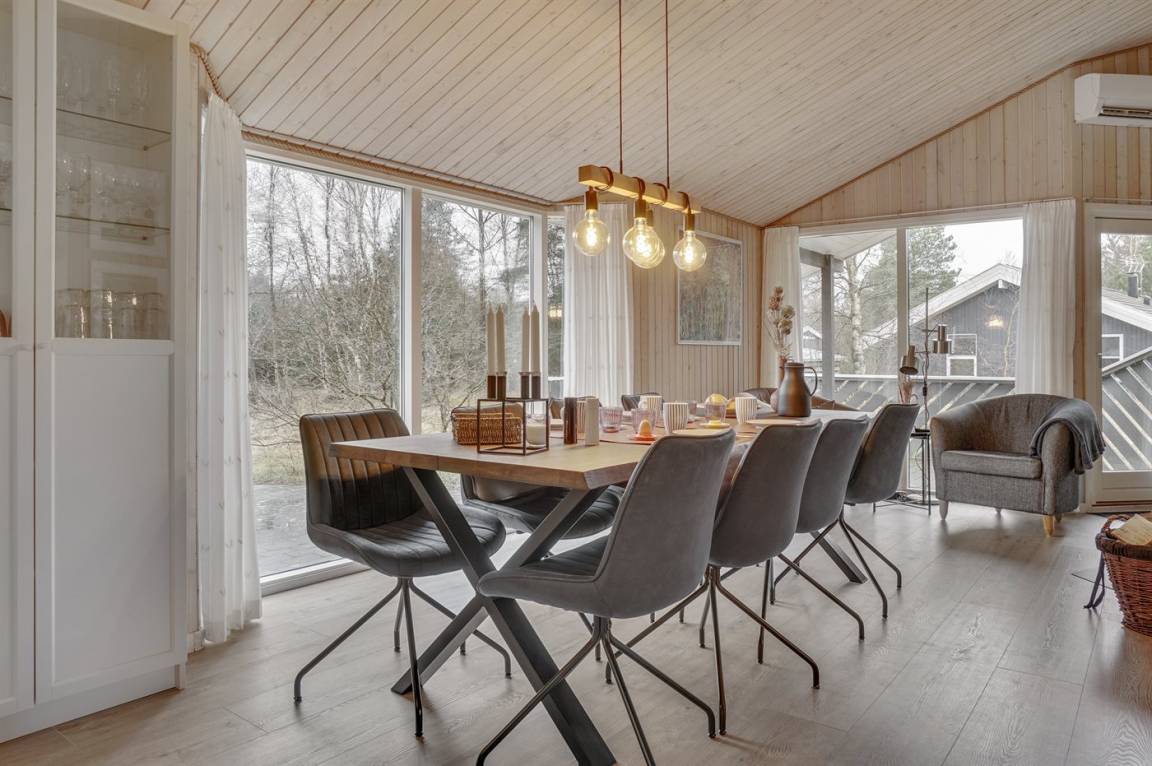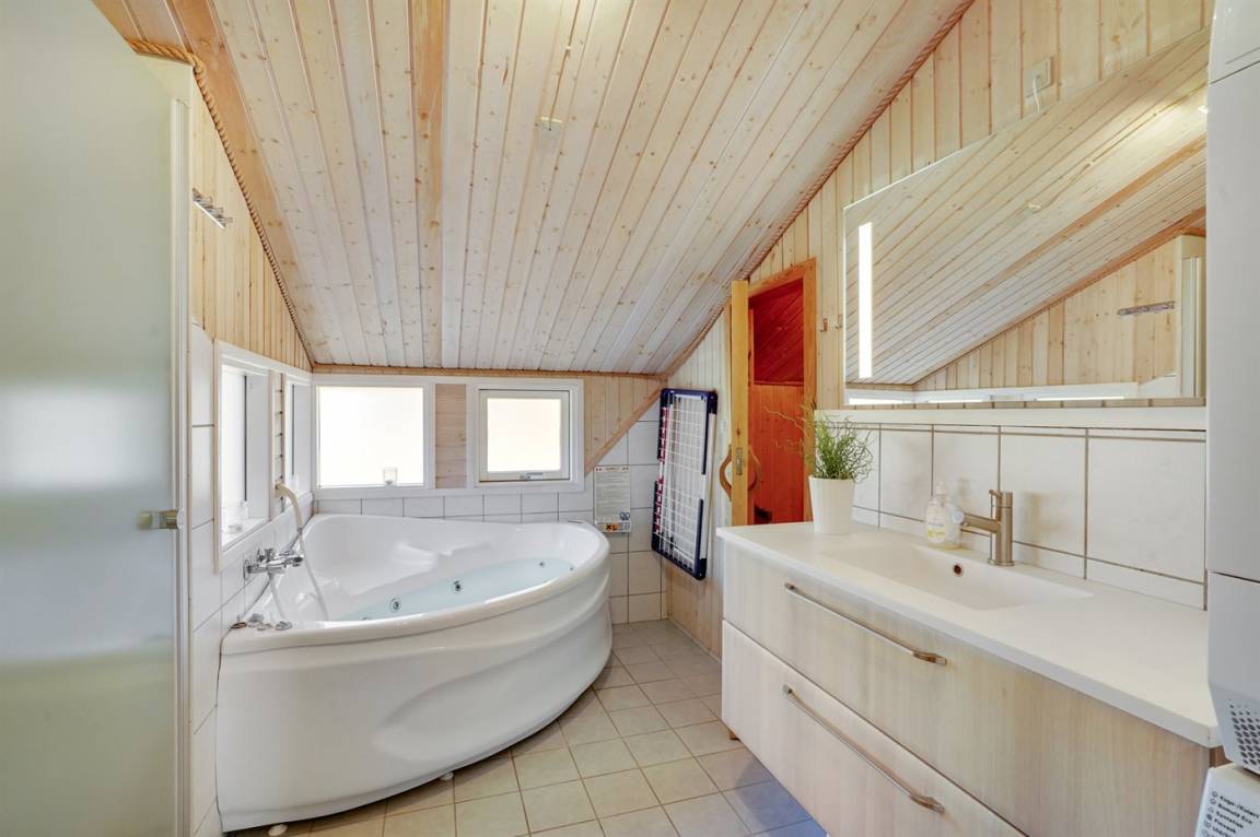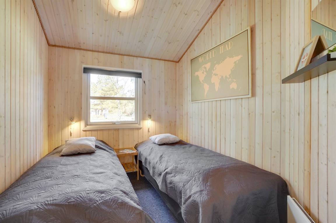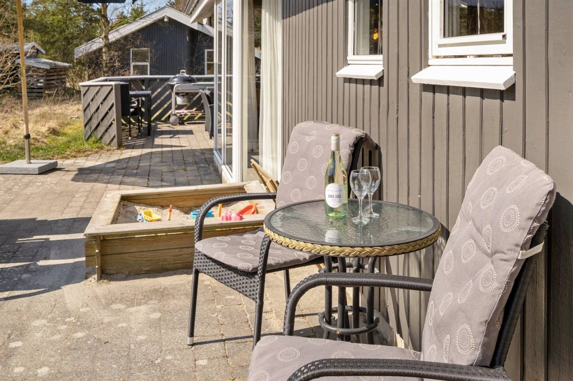 Ein wirklich schönes, gut ausgestattetes Ferienhaus, 2000 gebaut und laufend renoviert. Offene sowohl als überdachte Terrasse mit netten Gartenmöbeln. Innen sind Wände und Decken mit hellem Holz verkleidet, Holzboden in dem Wohnzimmer und Teppichboden in den Zimmern. 2 schöne Badezimmer mit Duschnische und Fußbodenheizung; das eine Badezimmer hat ebenfalls einen schönen 2-Pers.-Whirlpool und Zugang zur Sauna. Die Küche ist mit dem Wohnzimmer kombiniert und enthält u. a. Herd mit Ceran-Feld, Umluftofen, Tiefkühlgerät, Mikrowelle und Geschirrspüler. Schönes, großes Wohnzimmer mit Kaminofen, TV mit digitalem Satellitenanschluss, Video, DVD-Spieler und Stereoanlage mit CD-Spieler. Kostenlose ADSL-Internetverbindung (eigener Computer muss mitgebracht werden). Offenes Obergeschoss mit TV für Spiele. Das Haus ist mit 4 Schlafzimmer eingerichtet: 2 mit Doppelbett und 2 mit je 2 Einzelbetten. Ferner gibt es 2 Schlafplätze auf Matratzen im offenen Obergeschoss. An weiterer Ausstattung können Waschmaschine, Wäschetrockner und 2 zusätzliche TV's erwähnt werden. Für die kleinen Feriengäste stehen Schaukel, Sandkasten, Kinderbett und Kinderhochstuhl zur Verfügung. Das Haus ist ein besonders schönes Ferienhaus für sowohl 1 als auch 2 Familien. Das naturschöne Gebiet bietet viele Möglichkeiten für Wanderungen in der großartigen Natur entweder im Waldgebiet oder beim Meer, wo Sie abends die Fischer arbeiten sehen können. Es gibt besonders gute Bade- und Angelmöglichkeiten im Gehabstand vom Haus. In der nah gelegenen Stadt Fjerritslev gibt es viele Aktivitätsmöglichkeiten, u. a. Schwimmhalle, Bowling oder Shopping.