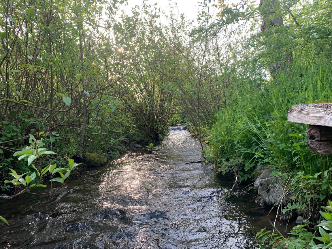 Das Plätschern des naturbelassener Naturbaches lässt sich bei geöffneter Balkontüre vom Schlafbereich aus genießen.