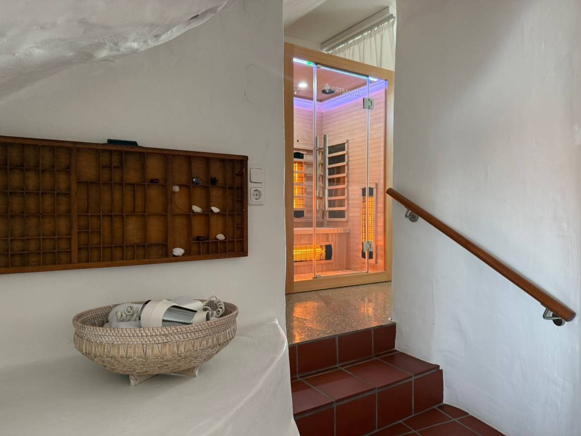 Pantryküche mit Theke und Barhockern, ein gemütlicher Essbereich, mit Blick in den Garten, Lese- und Yoganische sowie ein kompaktes Duschbad mit WC und Waschbecken befinden sich, wie auch der Massagesessel, auf Ebene 1. Im Durchgangsbereich auf Ebene 2 steht die Infrarotkabine für 2 zur Alleinnutzung zur Verfügung.