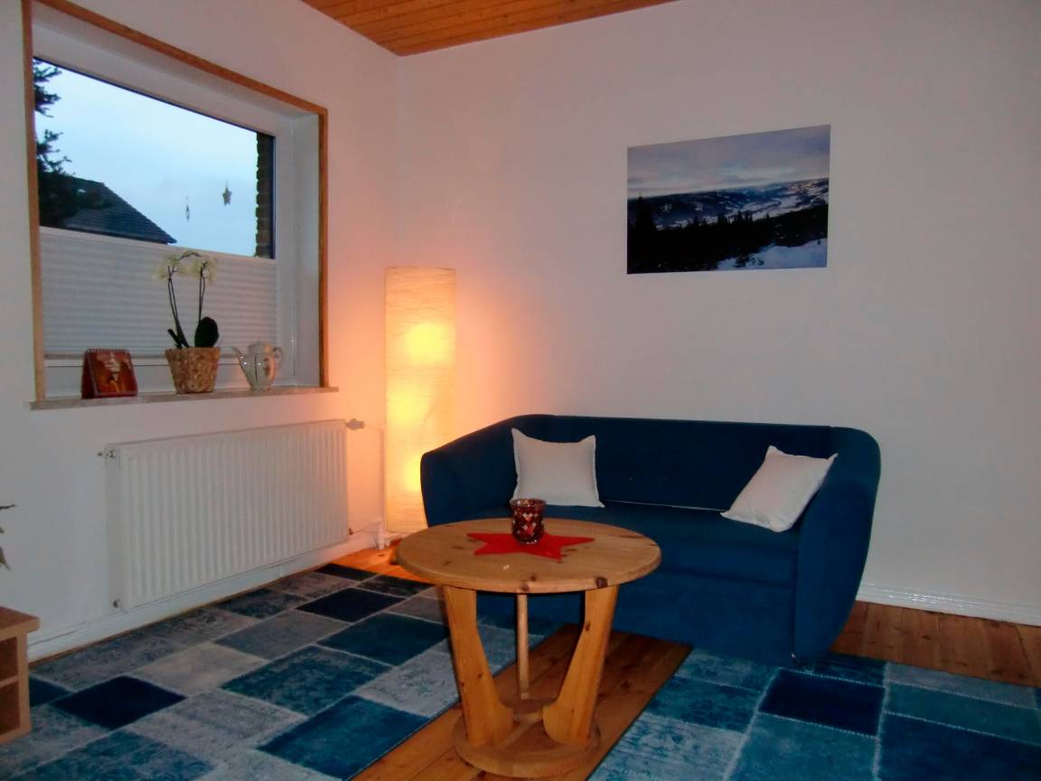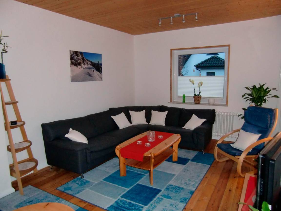 Im großem Wohnzimmer steht eine gemütliche Ecksitzgruppe mit einem Flachbildschirm, Kabel - TV und DVD - Player. WLAN vorhanden.