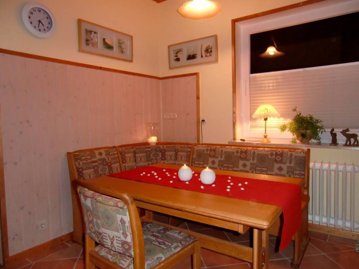 Die Küche ist mit einer Einbauküche und einer Ecksitzbank ausgestattet. Über dem Kühlschrank befindet sich ein Gefrierfach. Der Herd hat ein 4 - Zonen Cerankochfeld mit Dunstabzugshaube und Backofen. Geschirrspüler ( 6 Teilig ),