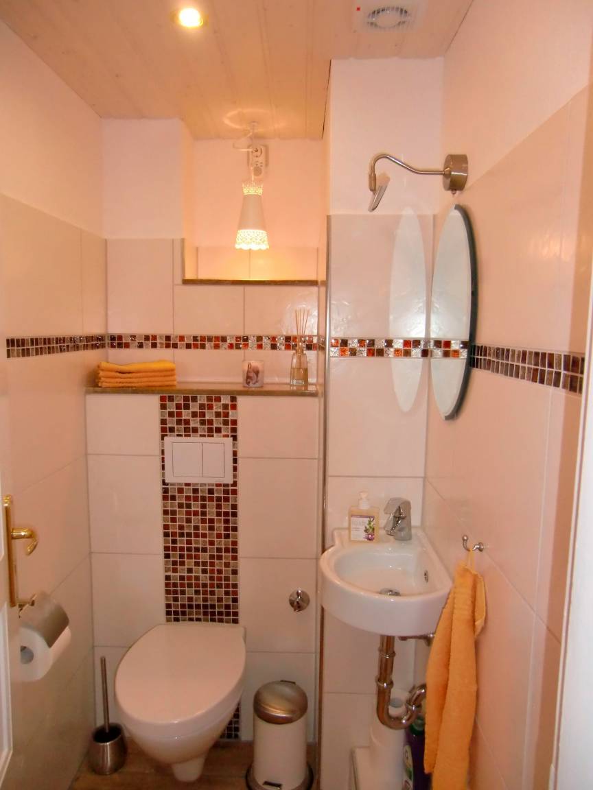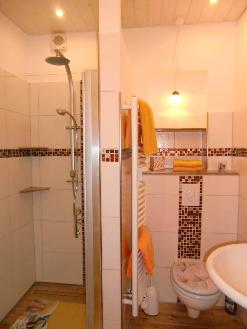 Das Duschbad besteht auch aus einer Massagebrause, einem Waschbecken, Fön, WC, Handtuchheizkörper und einer Fußbodenheizung. Im Gäste - WC befindet sich ein kleines Handwaschbecken. Der Eingangsbereich zeichnet sich durch einen langen Flur aus, von dem man das Kinderzimmer, das Wohnzimmer, das Gäste - WC, das Duschbad und die Küche erreichen kann.