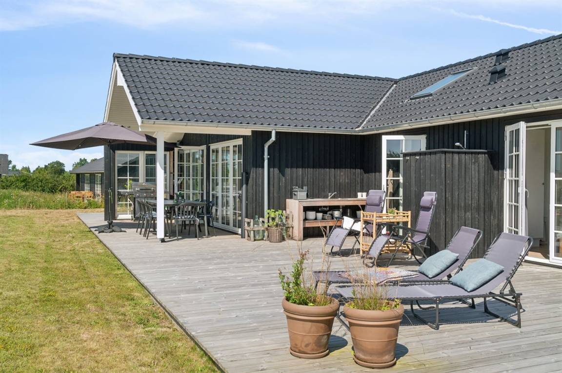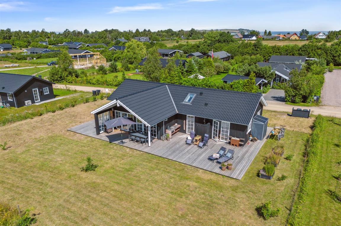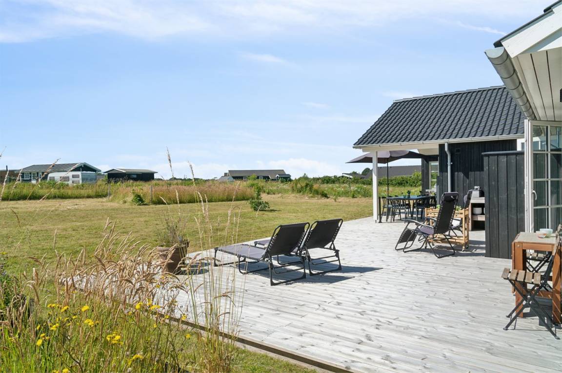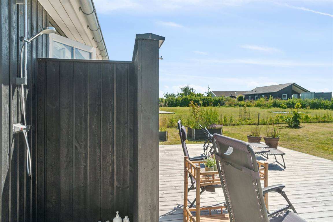 Dieses neue Qualitätsferienhaus von 2022 liegt in einer neuen Siedlung aus schönen neuen Ferienhäusern und ist nur 550 m vom Meer entfernt. Das Haus ist von einer 130 m² großen Holzterrasse umgeben, von der ein großer Teil überdacht ist. Es gibt eine Außenküche und Außenduschen, die das Erlebnis von Urlaub unter freiem Himmel vervollständigen.