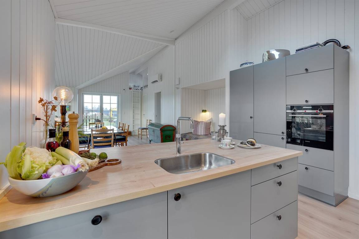 Küche, Essbereich und Wohnzimmer grenzen offen aneinander an und bilden einen idealen Treffpunkt für gemütliches Beisammensein. In der Wohnküche befindet sich ein offenes Obergeschoss mit einem Alkoven, wo man sich optimal entspannen kann. Das Haus hat 3 Schlafplätze mit je 2 Schlafplätzen und 2 Badezimmer mit Fußbodenheizung und Duschnische.
