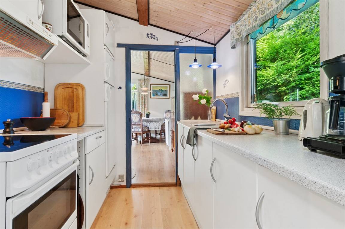 Im Inneren findest du ein großes, helles Wohn- und Esszimmer, mit viel Platz für das gemeinsame Beisammensein mit Familie und Freunden. Die Küche ist nicht mehr ganz neu, aber funktional. Es gibt drei Schlafzimmer; eines mit Doppelbett, eines mit zwei Einzelbetten und eines mit einer Doppelschlafcouch. Im Gästehaus findest du zwei weitere Schlafplätze in einem Doppelbett. Das moderne Badezimmer verfügt über eine Duschnische, Fußbodenheizung und eine Waschmaschine.