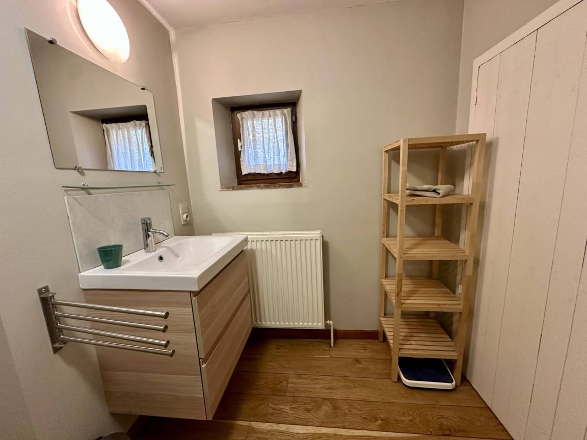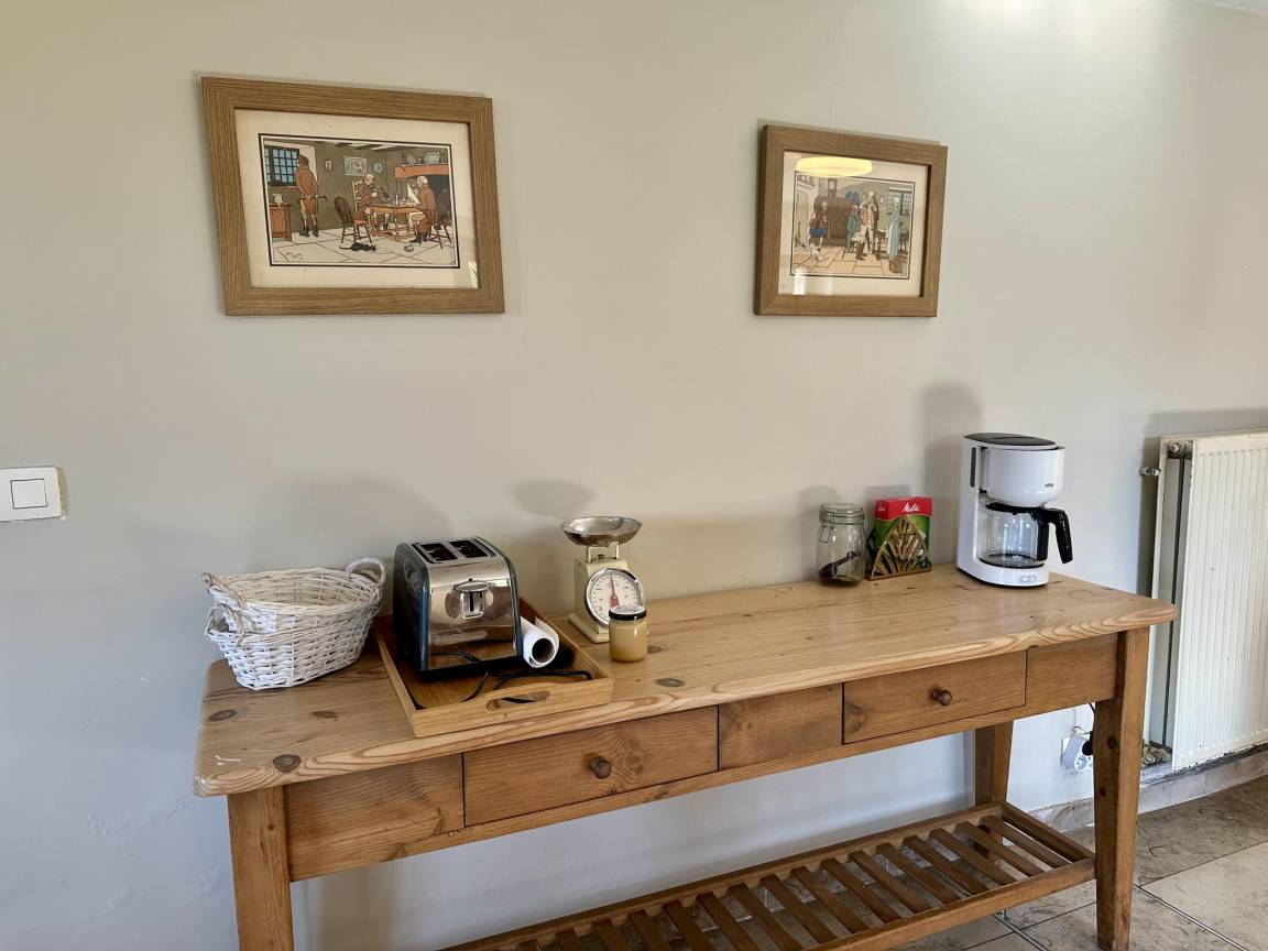 Layout : Parterre: Eingang, Aufenthaltsraum mit TV, Ofen(Holz) , Esszimmer mit Esstisch(6 Personen) , Küche mit Kochplatte(4 Kochplatten, Ceranfeld), Wasserkocher, Toaster, Kaffeemaschine(Filter, senseo pads), Backofen, Mikrowelle, Geschirrspüler, Kühlschrank, Tiefkühlschrank, Zitruspresse, Mixer , Toilette, Waschraum mit Waschmaschine