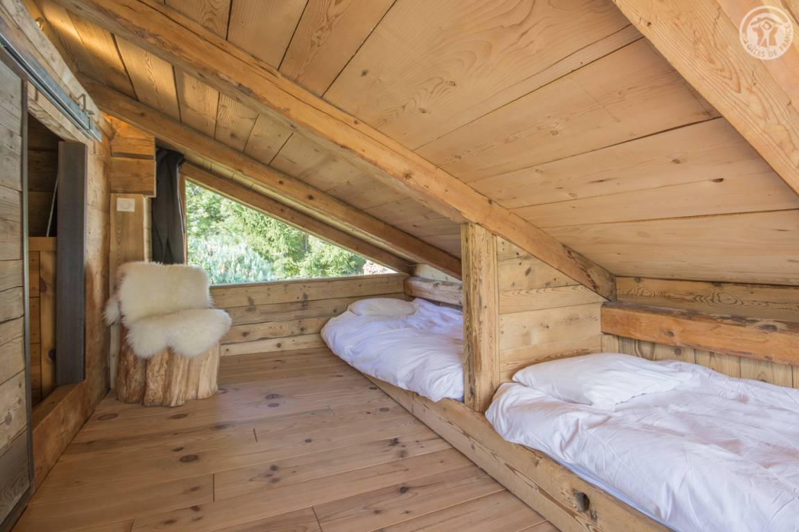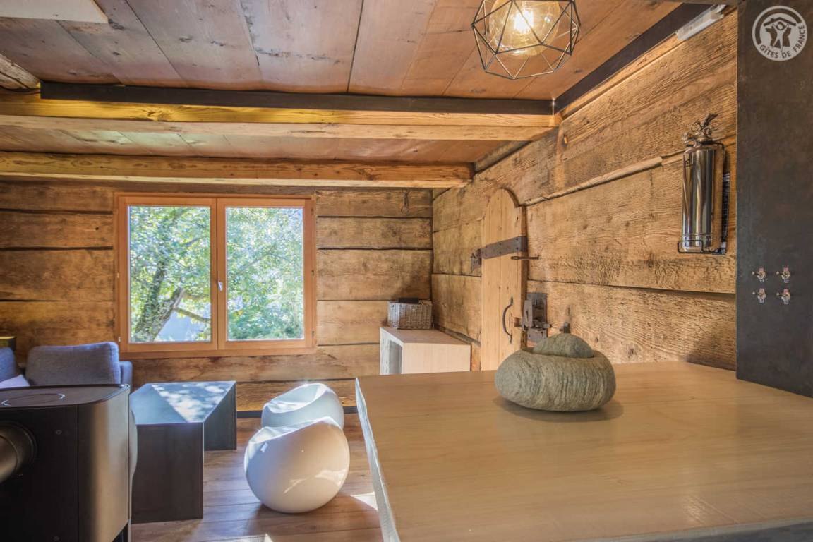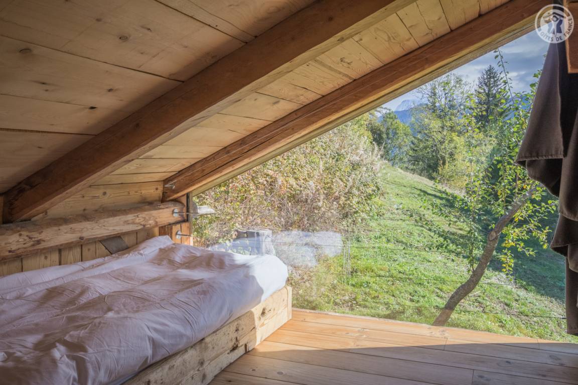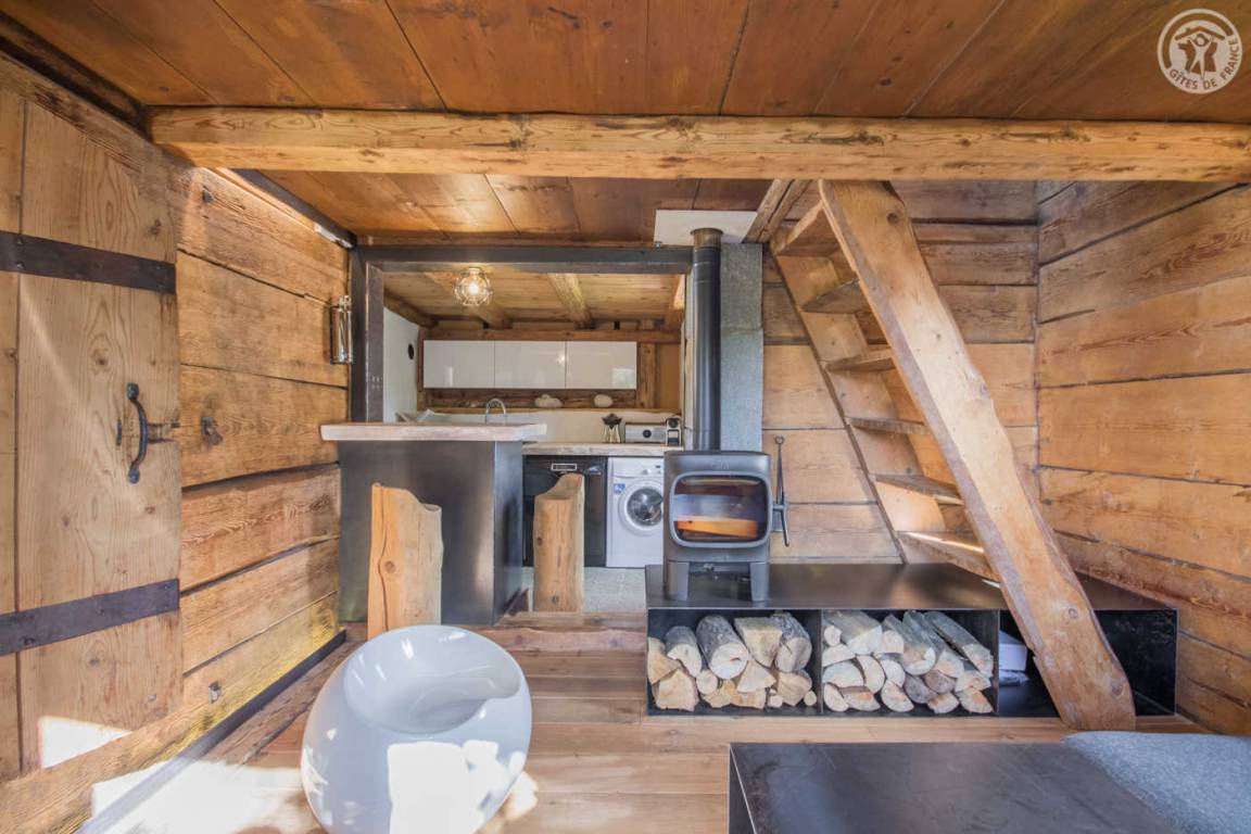 „Aménagement esthétique, mais inconfortable et inadapté, notamment la table et sièges pour les repas. Dernière marche de l'escalier en métal, beaucoup trop haute, absence de rembarde. La seconde chambre, mansardée, est compliquée pour des adultes car très basse de plafond (en biais) et poutres. On se cogne souvent. Un congélateur est annoncé sur la liste des équipement, or il n'y a ni congélateur ni freezer dans le réfrigérateur. Insuffisamment débrousaillé en extérieur. De la terrasse en herbe, vue magnifique sur le Mont Blanc et départs de randonnées sur place ou très proches.“