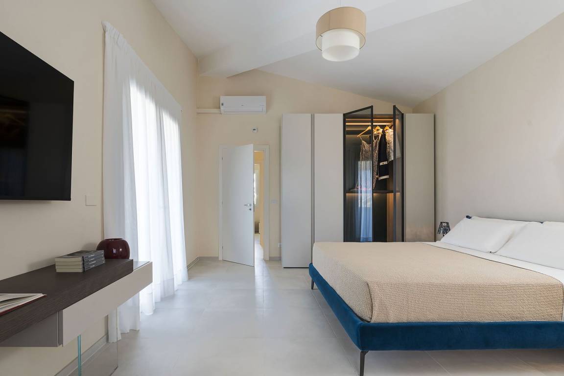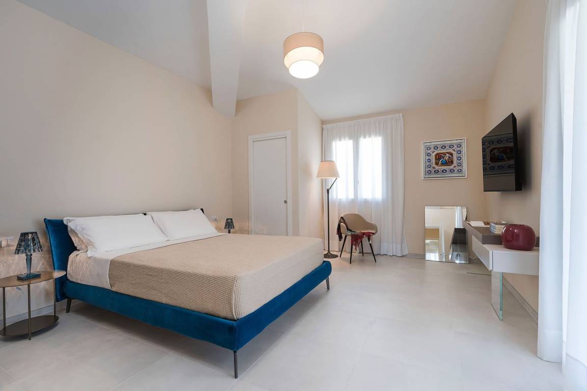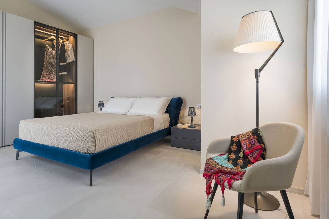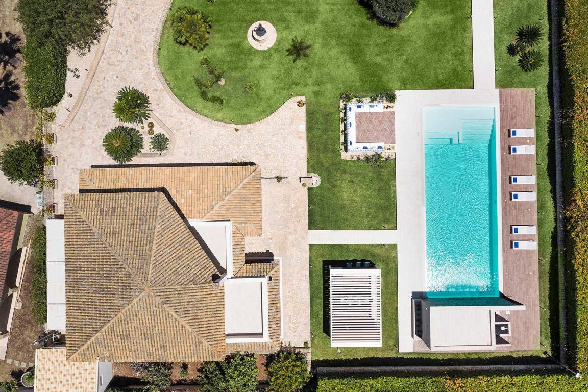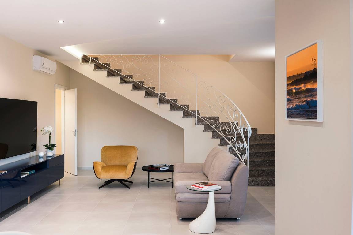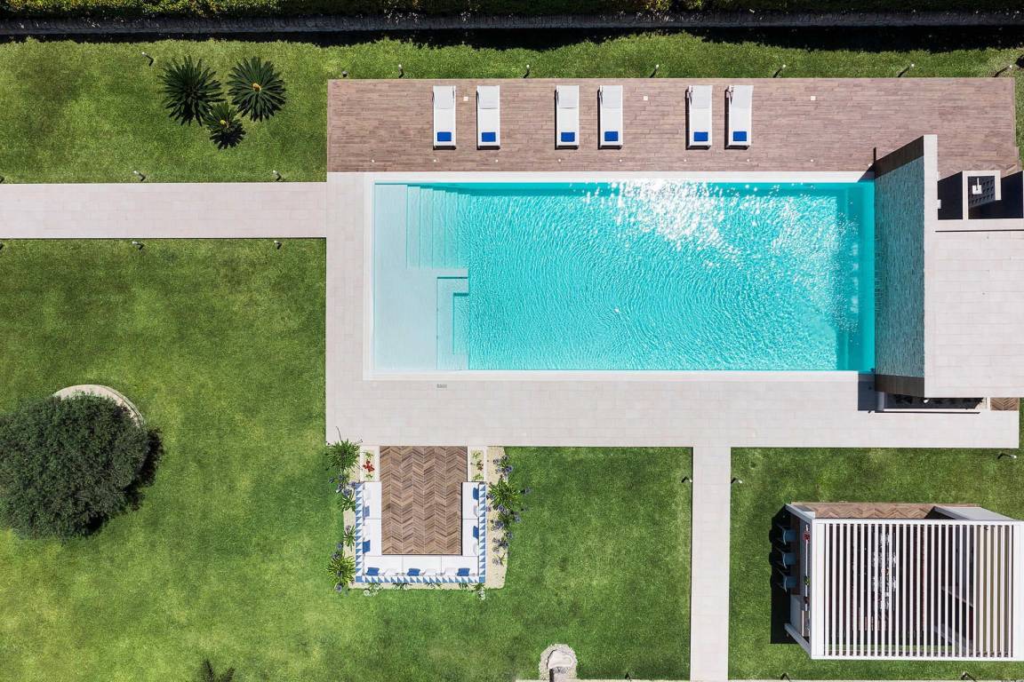 Die Villa Agorà bietet Platz für bis zu 6 Gäste auf einer Gesamtfläche von 3 Schlafzimmern und 3 Bädern. Das Erdgeschoss und die oberen Bereiche sind so gestaltet, dass die Innenräume natürlich zu den Außenbereichen übergehen und eine nahtlose Verbindung zwischen dem Wohnbereich und dem umgebenden Garten sowie dem Poolbereich schaffen.