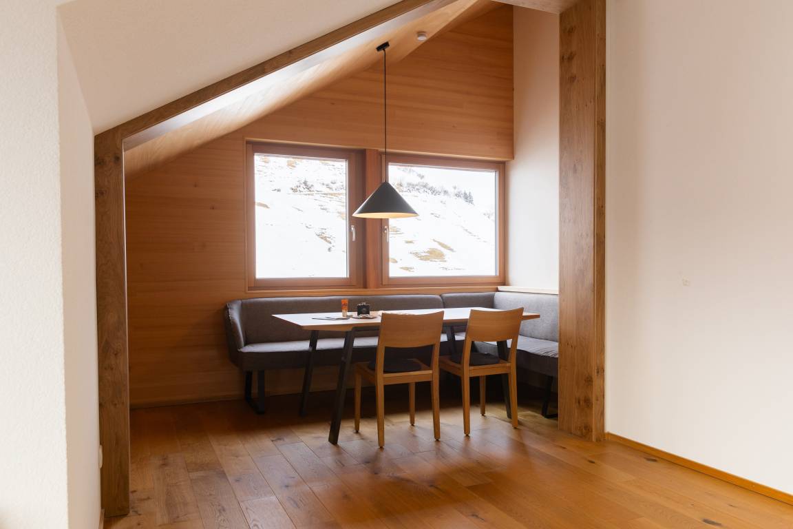 Das Apartment 14 im Berg Aparts Faschina ist sehr liebevoll und auch sehr hochwertig eingerichtet. Der Wohn- und Essbereich bietet mit seinem großen Esstisch und Fenster-Sofa viel Platz zum entspannen und genißen. Der wunderschöne Panoramablick auf die Bergwelt des Großen Walsertals ist einzigartig.