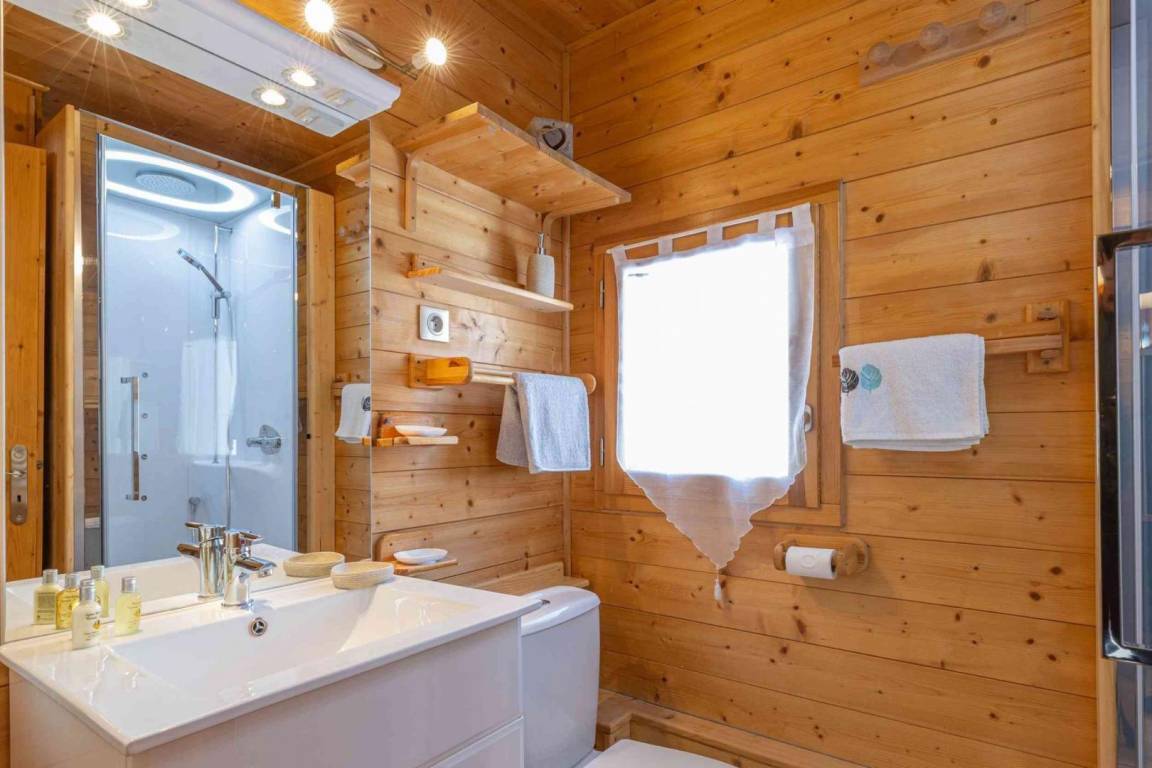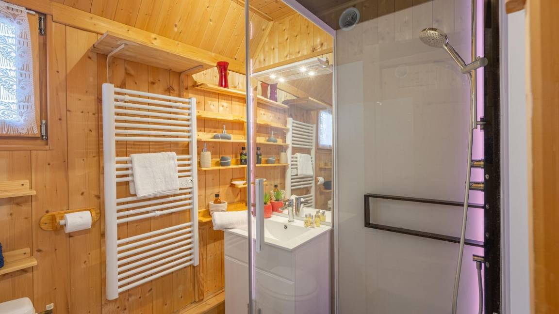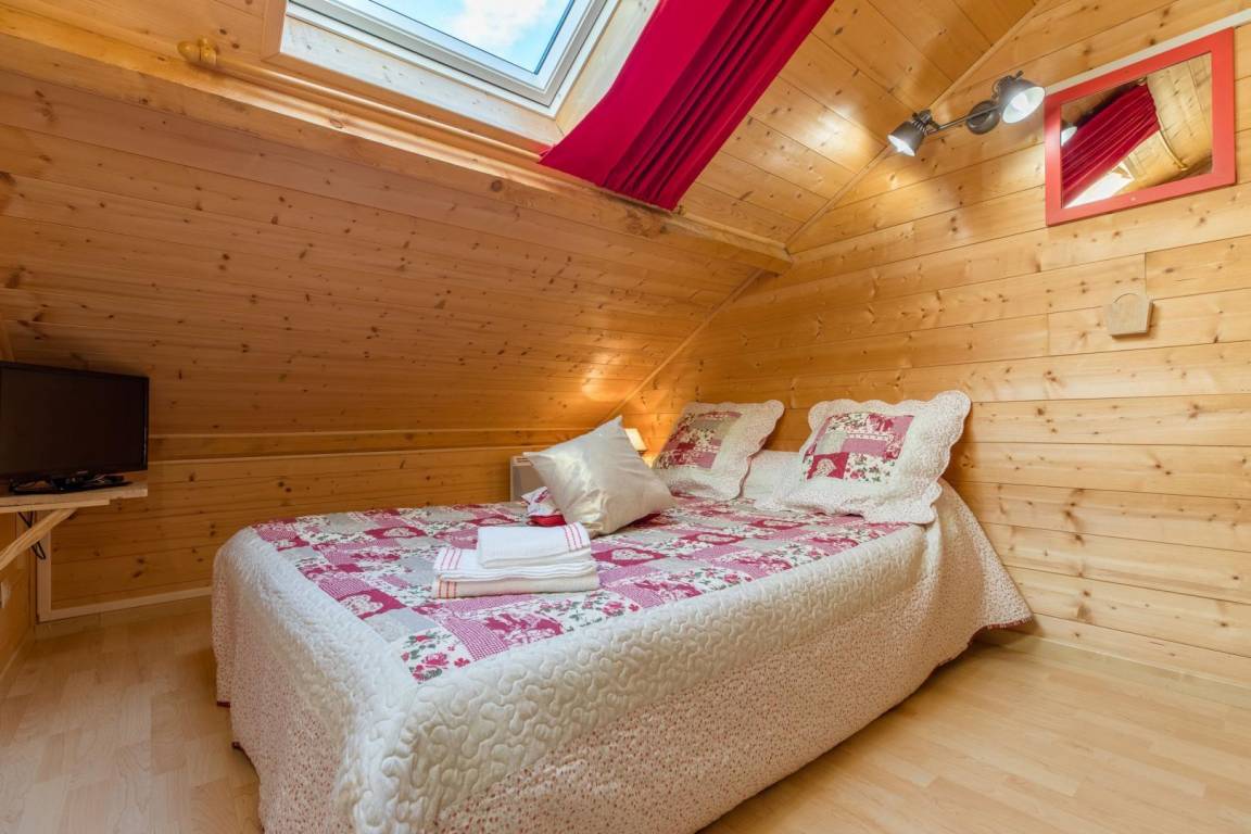 Ferienhaus auf 2 Etagen, bestehend aus auf der 1. Ebene (Zugang über 2 Außentreppen vom Parkplatz aus): eine Eingangshalle, ein Wohnzimmer-Küche-Wohnzimmer, 2 Schlafzimmer (1 Doppelbett 140x190 cm / 1 Doppelbett 140x190 cm), ein Kabinenschlafzimmer (2 Etagenbetten), Badezimmer (Dusche mit Hydromassage-Regenstrahl und WC), separates WC. 2. Ebene: 5 Schlafzimmer, davon 1 mit eigener Dusche und WC (4 Doppelbetten 140x190 cm / 2 Einzelstockbetten, ein Badezimmer (Badewanne und WC). Alle Schlafzimmer außer der Kabine haben einen Fernseher. Private Terrasse nach Süden ausgerichtet. der Westen. Gemeinsame Parkplatz beim Chalet.