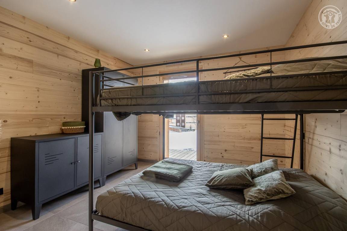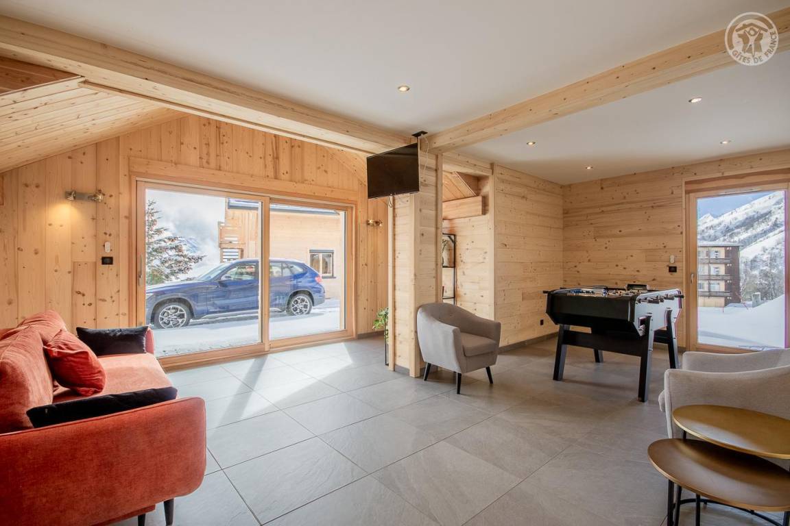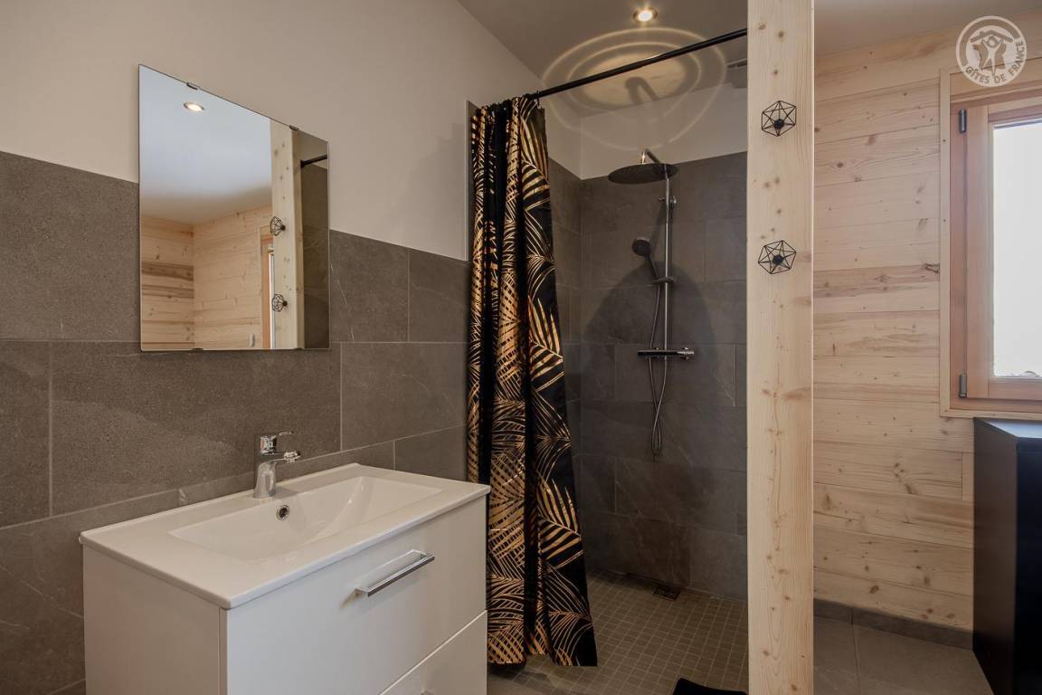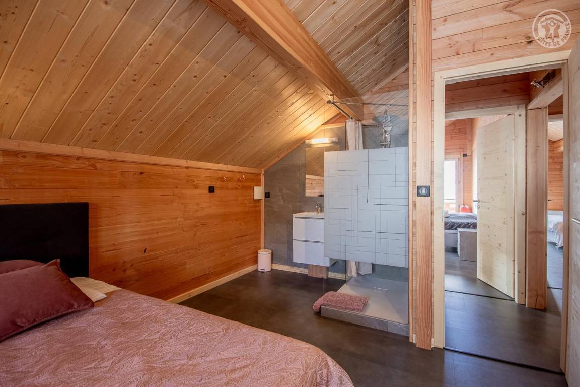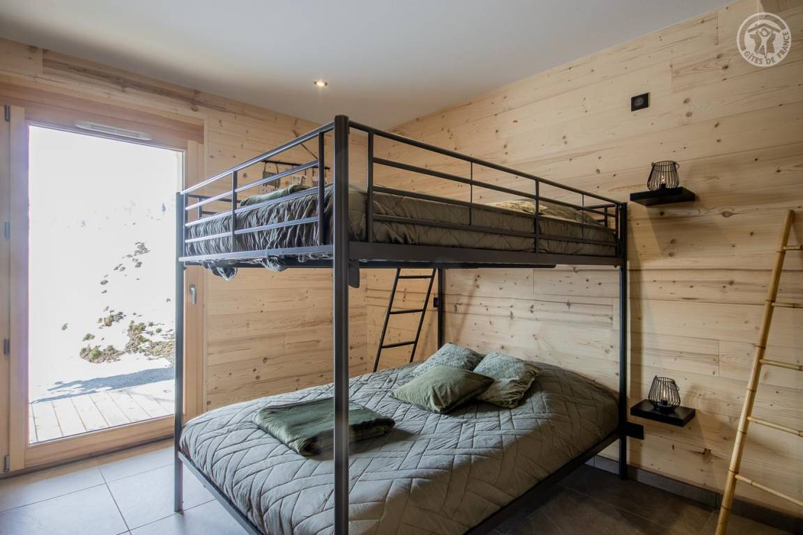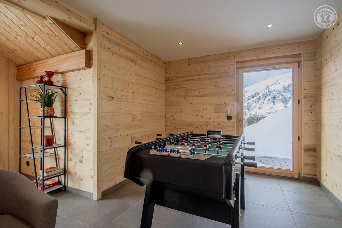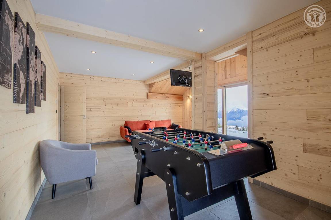 Individuelles Chalet auf 3 Ebenen, darunter im Erdgeschoss: ein großes Spielzimmer (Fernseher, Tischfußball) mit Zugang zur Terrasse (kosmische Sauna und norwegisches Bad), 1 Schlafzimmer (2 Doppelbetten 140 x 190 cm, Etagenbett) und Badezimmer mit eigenem Wasser (Dusche und WC). WC), 1 Schlafzimmer (1 Doppelbett 160x200 cm mit Dusche und WC), 1 Schlafzimmer (1 Doppelbett 160x200 cm und Dusche), separates WC. 1. Stock: Eingang, Waschküche, Wohnküche mit Balkon-Terrasse (Tisch und 10 Stühle), separates WC. 2. Etage: 2 Schlafzimmer (1 Doppelbett 160x200 cm/1 Doppelbett 160x200 cm) mit eigenem Bad (Dusche und WC), 2 Schlafzimmer (2 Einzelbetten 90x190 cm und Dusche / 1 Doppelbett 160x200 cm mit Dusche und WC), Balkon .