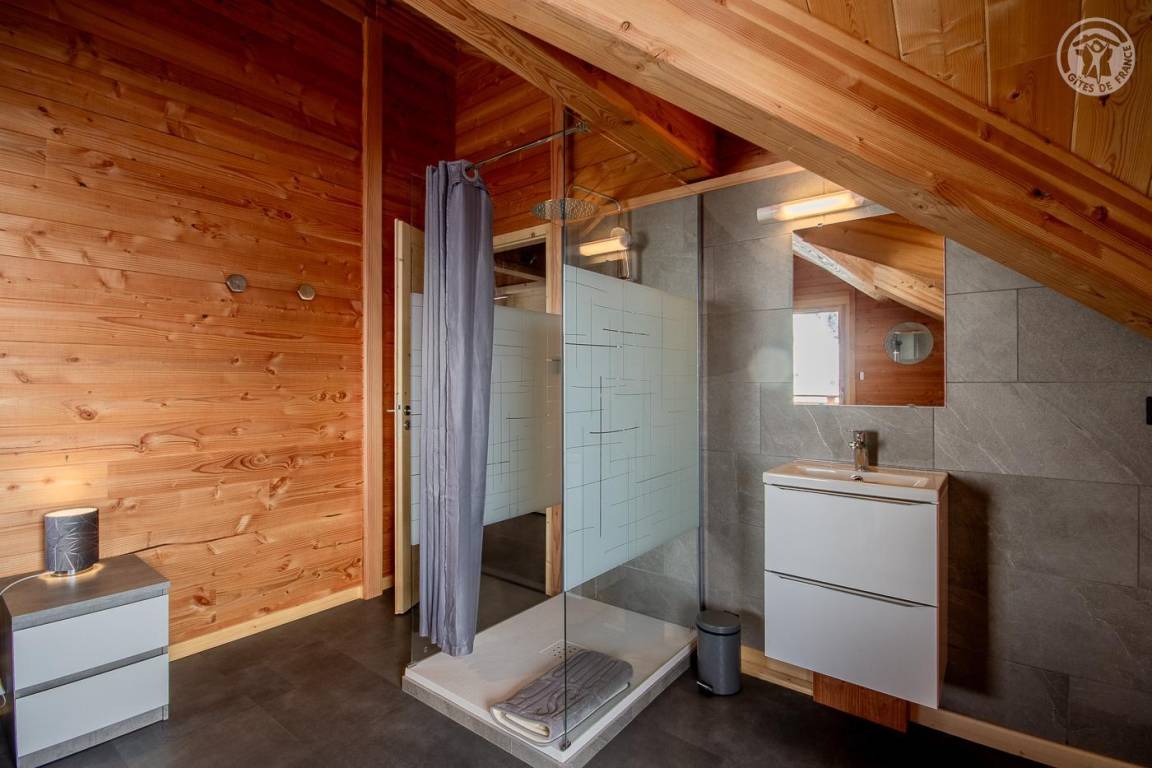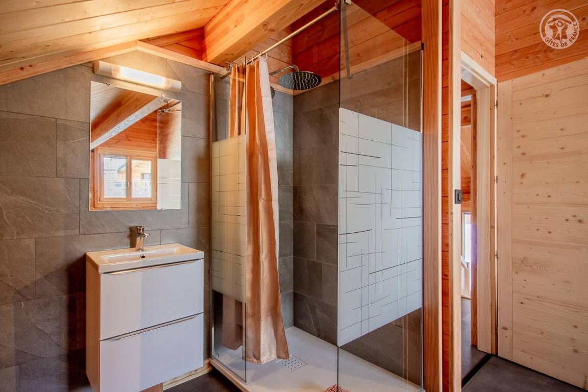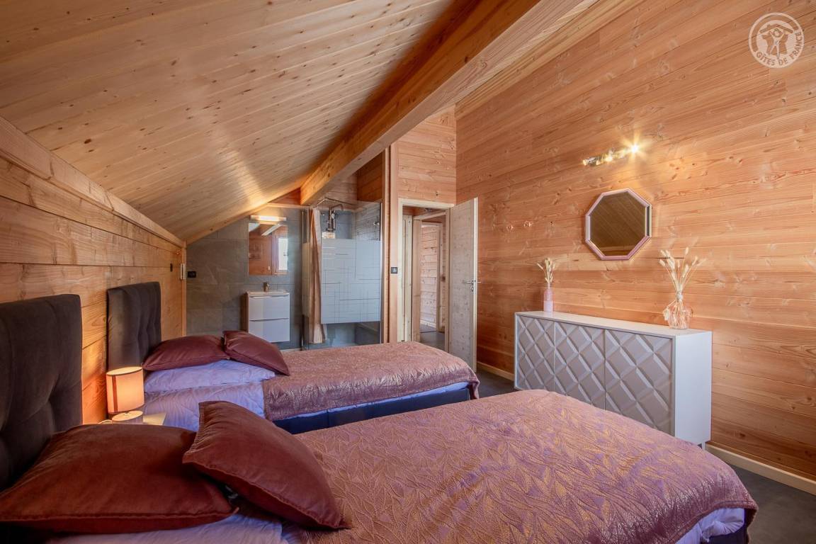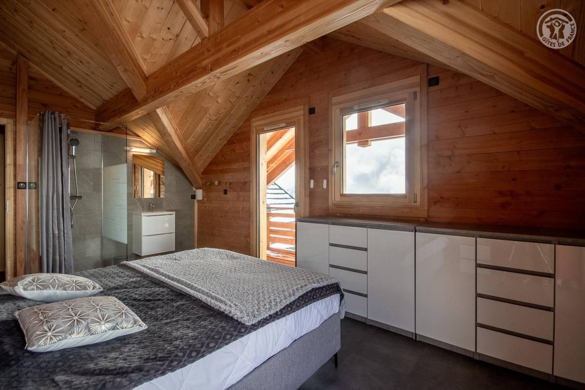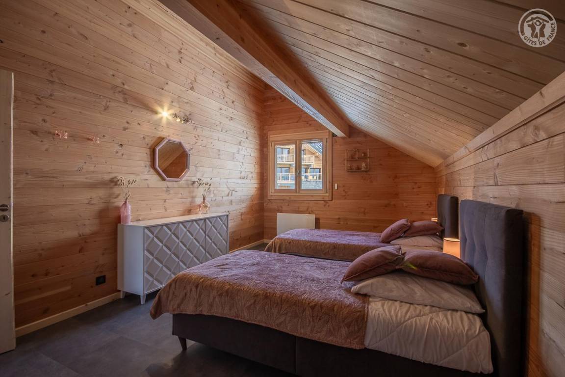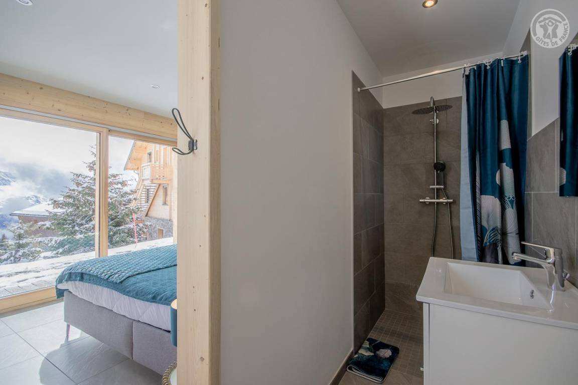 Individuelles Chalet auf 3 Ebenen, darunter im Erdgeschoss: ein großes Spielzimmer (Fernseher, Tischfußball) mit Zugang zur Terrasse (kosmische Sauna und norwegisches Bad), 1 Schlafzimmer (2 Doppelbetten 140 x 190 cm, Etagenbett) und Badezimmer mit eigenem Wasser (Dusche und WC). WC), 1 Schlafzimmer (1 Doppelbett 160x200 cm mit Dusche und WC), 1 Schlafzimmer (1 Doppelbett 160x200 cm und Dusche), separates WC. 1. Stock: Eingang, Waschküche, Wohnküche mit Balkon-Terrasse (Tisch und 10 Stühle), separates WC. 2. Etage: 2 Schlafzimmer (1 Doppelbett 160x200 cm/1 Doppelbett 160x200 cm) mit eigenem Bad (Dusche und WC), 2 Schlafzimmer (2 Einzelbetten 90x190 cm und Dusche / 1 Doppelbett 160x200 cm mit Dusche und WC), Balkon .