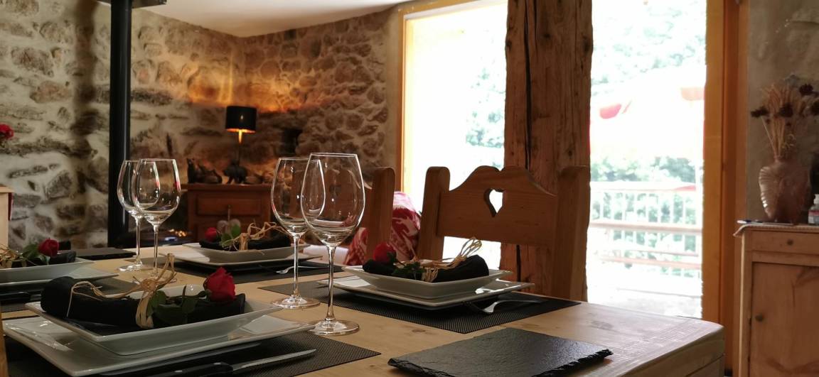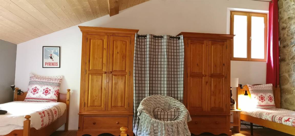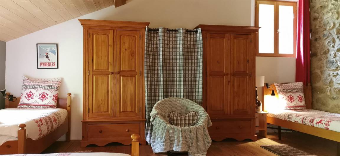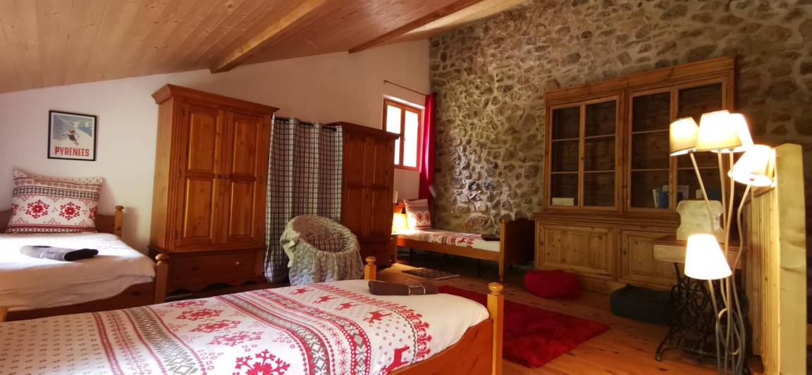 „Gîte tout confort, murs en pierre, propice à la détente dans une ambiance montagne, autour du poêle à bois, face aux Pyrénées. Juste une petite habitude à prendre pour l'escalier à pas japonais, qui mène à une grande chambre pour les enfants!“