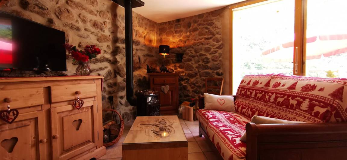 Wohnzimmer mit ausgestatteter Küche (Holzofen – 1 Korb Holz vorhanden).
