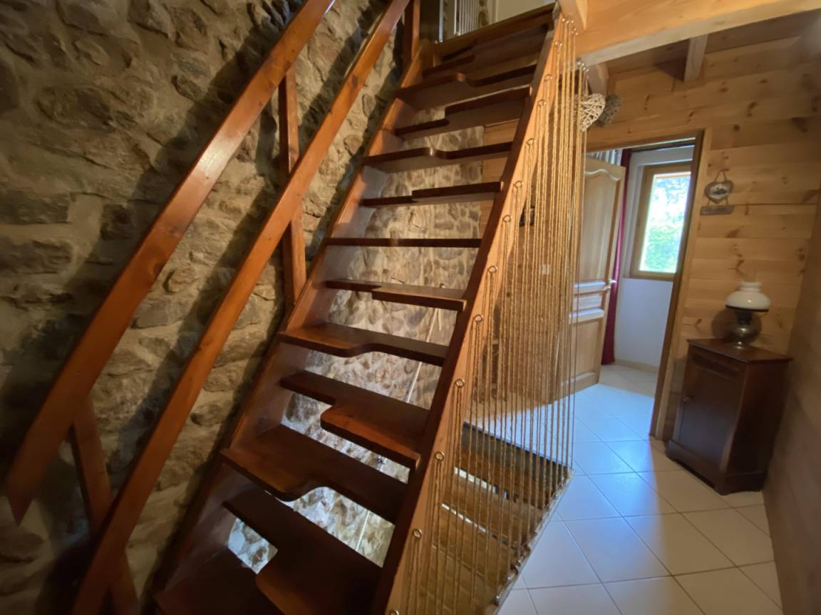 Der Zugang zu den oberen Etagen der Gîte erfolgt über eine japanische Treppe, die durch eine Sicherheitsbarriere und ein Geländer gesichert ist.